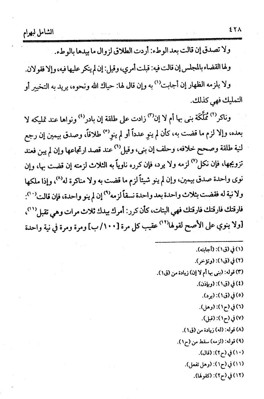 وناكر (¬2) مُمَلَّكَة بنى بها أم لا إن (¬3) زادت على طلقة إن بادر (¬4) ونواها عند تمليكه لا بعده، وإلا لزم ما قضت به، كأن لم ينوِ عدداً أو لم ينوِ (¬5) طلاقاً، وصدق بيمين إن رجع لنية طلقة وصحح خلافه، وحلف إن بنى، وقيل (¬6) عند قصد ارتجاعها وإن لم يبن فعند تزويجها، فإن نكل (¬7) لزمه ولا يرد، فإن كرره ناوياً به الثلاث لزمته إن قضت بها، وإن نوى واحدة صدق بيمين، وإن لم ينو شيئاً لزم ما قضت به ولا مناكرة له (¬8)، وإذا ملكها ولا نية له فقضت بثلاث واحدة بعد واحدة نسقاً لزمه (¬9) إن لم ينو واحدة، فإن قالت (¬10): فارقتك فارقتك فارقتك فهي البتات، كأن كرر: أمرك بيدك ثلاث مرات وهي تقبل (¬11)، [ولا ينوي على الأصح لقولها (¬12) عقيب كل مرة [أ/100] ومرة ومرة في نية واحدة