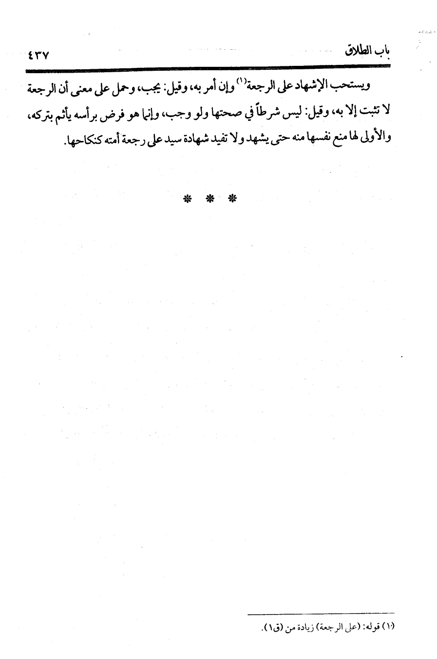 ويستحب الإشهاد على الرجعة (¬1) وإن أمر به، وقيل: يجب، وحمل على معنى أن الرجعة لا تثبت إلا به، وقيل: ليس شرطاً في صحتها ولو وجب، وإنما هو فرض برأسه يأثم بتركه، والأولى لها منع نفسها منه حتى يشهد ولا تفيد شهادة سيد على رجعة أمته كنكاحها.