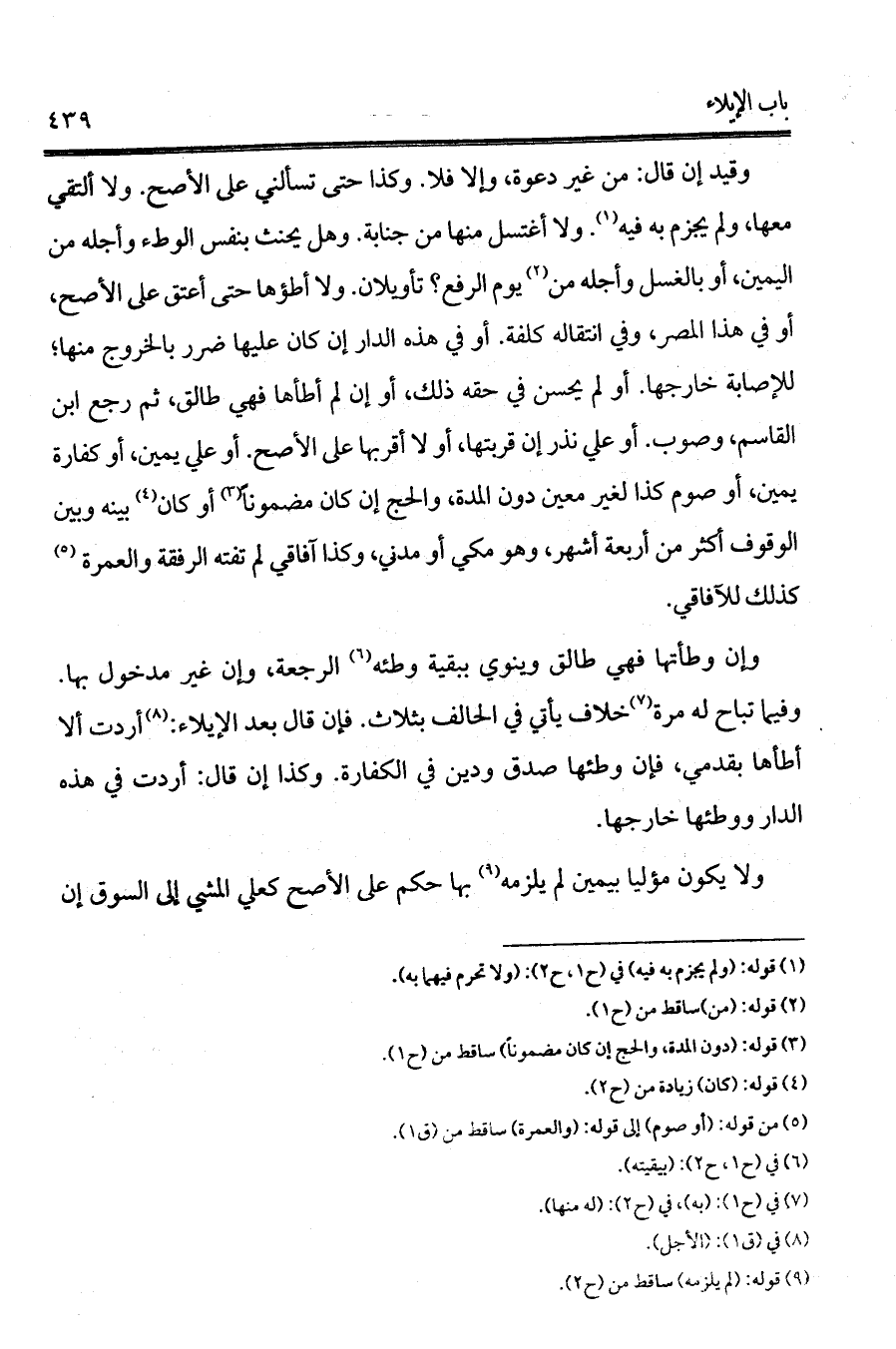 وقيد إن قال: من غير دعوة، وإلا فلا. وكذا حتى تسألني على الأصح. ولا ألتقي معها، ولم يجزم به فيه (¬1). ولا أغتسل منها من جنابة. وهل يحنث بنفس الوطء وأجله من اليمين، أو بالغسل وأجله من (¬2) يوم الرفع؟ تأويلان. ولا أطؤها حتى أعتق على الأصح، أو في هذا المصر، وفي انتقاله كلفة. أو في هذه الدار إن كان عليها ضرر بالخروج منها؛ للإصابة خارجها. أو لم يحسن في حقه ذلك، أو إن لم أطأها فهي طالق، ثم رجع ابن القاسم، وصوب. أو علي نذر إن قربتها، أو لا أقربها على الأصح. أو علي يمين، أو كفارة يمين، أو صوم كذا لغير معين دون المدة، والحج إن كان مضموناً (¬3) أو كان (¬4) بينه وبين الوقوف أكثر من أربعة أشهر، وهو مكي أو مدني، وكذا آفاقي لم تفته الرفقة والعمرة (¬5) كذلك للآفاقي. وإن وطأتها فهي طالق وينوي ببقية وطئه (¬6) الرجعة، وإن غير مدخول بها. وفيما تباح له مرة (¬7) خلاف يأتي في الحالف بثلاث. فإن قال بعد الإيلاء: (¬8)