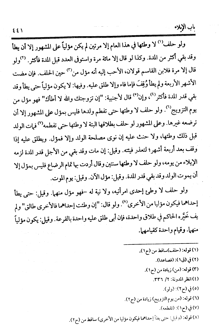 ويطلق عليه إذا وقف بعد أربعة أشهر؛ لتعذر فيئته. وقيل: إن مات وقد بقي من الأجل قدر المدة لزمه الإيلاء من يومه، ولو حلف لا وطئها سنتين وقال أردت بها تمام الرضاع فليس بمؤل إلا أن يموت الولد وقد بقي قدر المدة. وقيل: مؤل الآن. وقيل: يوم الموت، ولو حلف لا وطئ إحدى امرأتيه، ولا نية له -فهو مؤل منهما. وقيل: حتى يطأ إحداهما فيكون مؤليا من الأخرى (8). ولو قال: "إن وطئت إحداهما فالأخرى طالق" ولم يف خَيَّره الحاكم في طلاق واحدة، فإن أبى طلق عليه واحدة بالقرعة. وقيل: يكون مؤلياً منهما. وقيام واحدة كقيامهما.