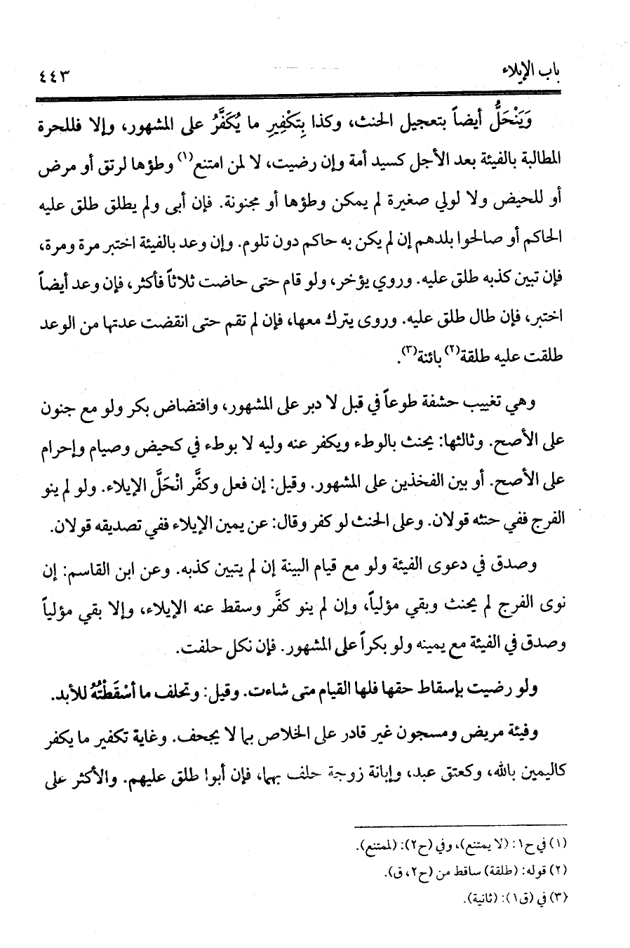 وهي تغييب حشفة طوعاً في قبل لا دبر على المشهور، وافتضاض بكر ولو مع جنون على الأصح. وثالثها: يحنث بالوطء ويكفر عنه وليه لا بوطء في كحيض وصيام وإحرام على الأصح. أو بين الفخذين على المشهور. وقيل: إن فعل وكفَّر انْحَلَّ الإيلاء. ولو لم ينو الفرج ففي حنثه قولان. وعلى الحنث لو كفر وقال: عن يمين الإيلاء ففي تصديقه قولان.