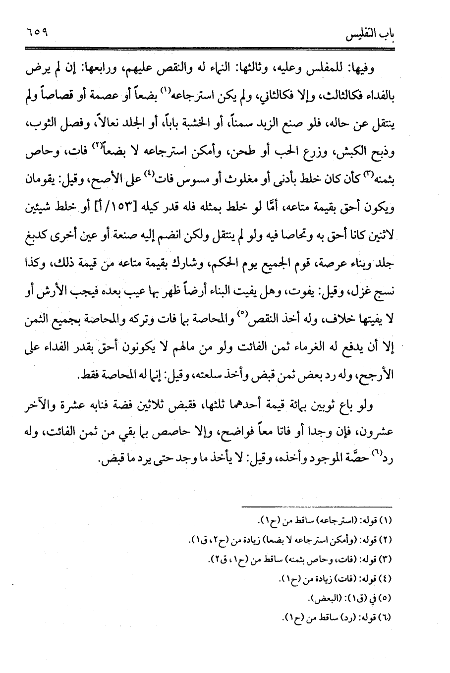 وفيها: للمفلس وعليه، وثالثها: النماء له والنقص عليهم، ورابعها: إن لم يرض بالفداء فكالثالث، وإلا فكالثاني، ولم يكن استرجاعه (¬1) بضعاً أو عصمة أو قصاصاً ولم ينتقل عن حاله، فلو صنع الزبد سمناً، أو الخشبة باباً، أو الجلد نعالاً، وفصل الثوب، وذبح الكبش، وزرع الحب أو طحن، وأمكن استرجاعه لا بضعاً (¬2) فات، وحاص بثمنه (¬3) كأن كان خلط بأدنى أو مغلوث أو مسوس فات (¬4) على الأصح، وقيل: يقومان ويكون أحق بقيمة متاعه، أمَّا لو خلط بمثله فله قدر كيله [ب/152] أو خلط شيئين لاثنين كانا أحق به وتحاصا فيه ولو لم ينتقل ولكن انضم إليه صنعة أو عين أخرى كدبغ جلد وبناء عرصة، قوم الجميع يوم الحكم، وشارك بقيمة متاعه من قيمة ذلك، وكذا نسج غزل، وقيل: يفوت، وهل يفيت البناء أرضاً ظهر بها عيب بعده فيجب الأرش أو لا يفيتها خلاف، وله أخذ النقص (¬5) والمحاصة بما فات وتركه والمحاصة بجميع الثمن إلا أن يدفع له الغرماء ثمن الفائت ولو من مالهم لا يكونون أحق بقدر الفداء على الأرجح، وله رد بعض ثمن قبض وأخذ سلعته، وقيل: إنما له المحاصة فقط.
