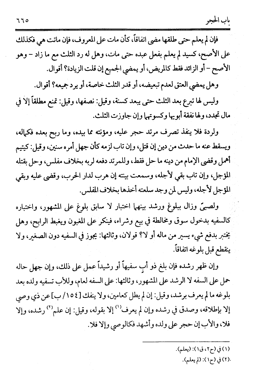 وإن ظهر رشده فإن بلغ ذو أبٍ سفيهاً أو رشيداً عمل على ذلك، وإن جهل حاله حمل على السفه لا الرشد على المشهور، وثالثها: على السفه لعام، وللأب تسفيه ولده بعد بلوغه ما لم يعرف برشد، وقيل: إن لم يطل كعامين، ولا ينفك [أ/154] عن ذي وصي إلا بإطلاقه، وصدق في رشده وإن لم يعرف (¬1) إلا بقوله، وقيل: إن علم (¬2) رشده، وإلا فلا، والأب إن حجر على ولده وأشهد فكالوصي وإلا فلا.