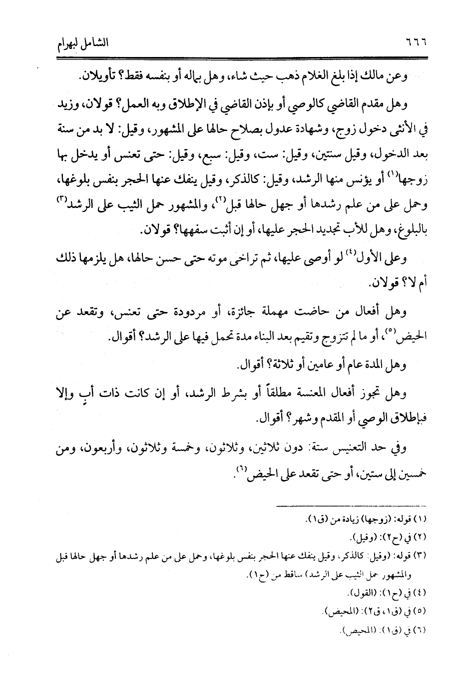 (4) قوله (وقيل: كالذكر، وقيل ينفك عنها الحجر بنفس بلوغها، وحمل على من علم رشدها أو جهل حالها قبل والمشهور حمل الثيب على الرشد) ساقط من (ح1).