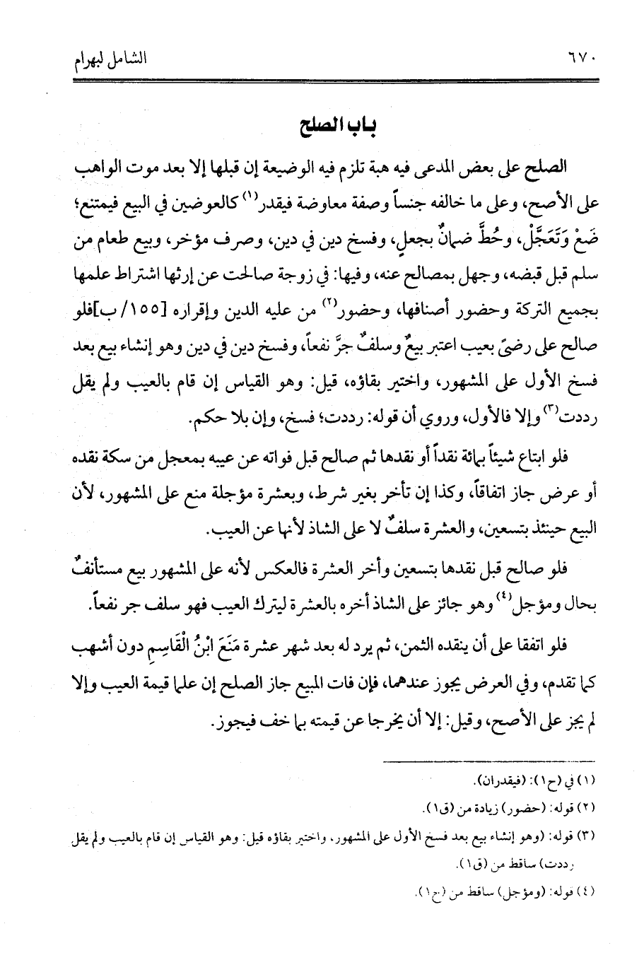 الصلح على بعض المدعى فيه هبة تلزم فيه الوضيعة إن قبلها إلا بعد موت الواهب على الأصح، وعلى ما خالفه جنساً وصفة معاوضة فيقدر (¬1) كالعوضين في البيع فيمتنع؛ ضَعْ وَتَعَجَّلْ، وحُطَّ ضمانٌ بجعلٍ، وفسخ دين في دين، وصرف مؤخر، وبيع طعام من سلم قبل قبضه، وجهل بمصالح عنه، وفيها: في زوجة صالحت عن إرثها اشتراط علمها بجميع التركة وحضور أصنافها، وحضور (¬2) من عليه الدين وإقراره [أ/155] فلو صالح على رضىً بعيب اعتبر بيعٌ وسلفٌ جرَّ نفعاً، وفسخ دين في دين وهو إنشاء بيع بعد فسخ الأول على المشهور، واختير بقاؤه، قيل: وهو القياس إن قام بالعيب ولم يقل رددت (¬3) وإلا فالأول، وروي أن قوله: رددت؛ فسخ، وإن بلا حكم.