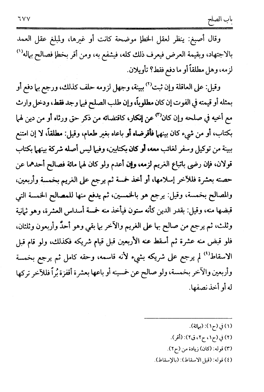 وقال أصبغ: ينظر لعقل الخطإ موضحة كانت أو غيرها، ولمبلغ عقل العمد بالاجتهاد، وبقيمة العرض فيعرف ذلك كله، فيشفع به، ومن أقر بخطإ فصالح بماله (¬2) لزمه، وهل مطلقاً أو ما دفع فقط؟ تأويلان.
