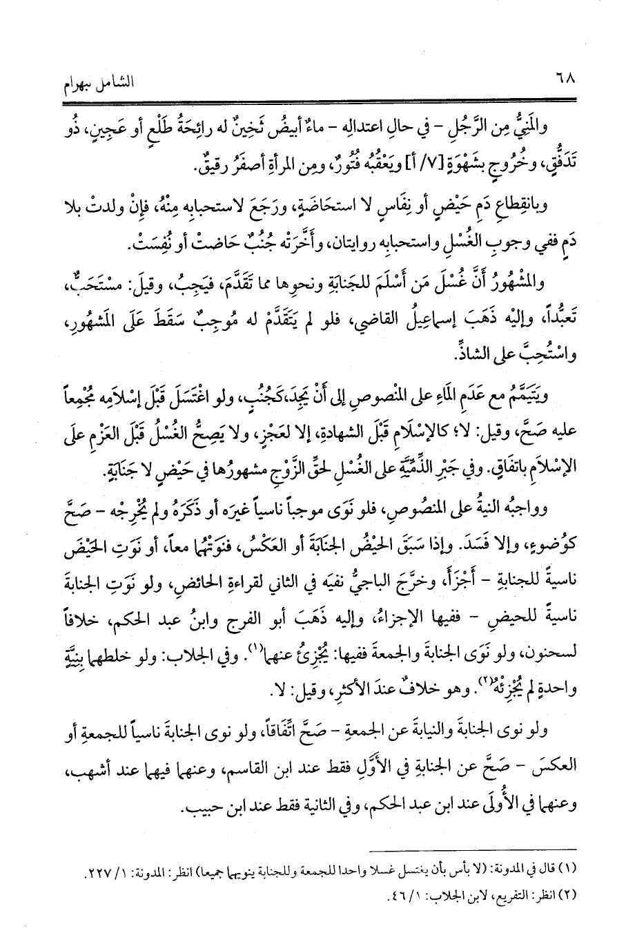 (¬1) قال في المدونة: (لا بأس بأن يغتسل غسلا واحدا للجمعة وللجنابة ينويهما جميعا) انظر: المدونة: 1/ 227.