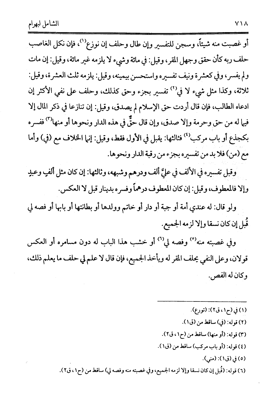 أو غصبت منه شيئاً، وسجن للتفسير وإن طال وحلف إن نوزع (¬1)، فإن نكل الغاصب حلف ربه كأن حقق وجهل المقر، وقيل: في مائة وشيء لا يلزمه غير مائة، وقيل: إن مات ولم يفسر، وفي كعشرة ونيف تفسيره واستحسن بيمينه، وقيل: يلزمه ثلث العشرة، وقيل: ثلاثة، وكذا مثل شيء لا في (¬2) تفسير بجزء وحق كذلك، وحلف على نفي الأكثر إن ادعاه الطالب، فإن قال أردت حق الإسلام لم يصدق، وقيل: إن تنازعا في ذكر المال إلا فيما له من حق وحرمة وإلا صدق، وإن قال حقٌّ في هذه الدار ونحوها أو منها (¬3) ففسره بكجذع أو باب مركب (¬4) فثالثها: يقبل في الأول فقط، وقيل: إنما الخلاف مع (في) وأما مع (من) فلا بد من تفسيره بجزء من رقبة الدار ونحوها.