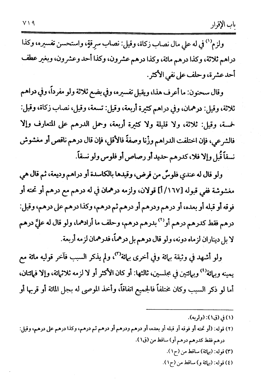 وقال سحنون: ما أعرف هذا، ويقبل تفسيره، وفي بضع ثلاثة ولو مفرداً، وفي دراهم ثلاثة، وقيل: درهمان، وفي دراهم كثيرة أربعة، وقيل: تسعة، وقيل، نصاب زكاة، وقيل: خمسة، وقيل: ثلاثة، ولا قليلة ولا كثيرة أربعة، وحمل الدرهم على المتعارف وإلا فالشرعي، فإن اختلفت الدراهم وزْنا وصفةً فالأقل، فإن قال درهم ناقص أو مغشوش نسقاً قُبل وإلا فلا، كدرهم حديد أو رصاص أو فلوس ولو نسقاً.