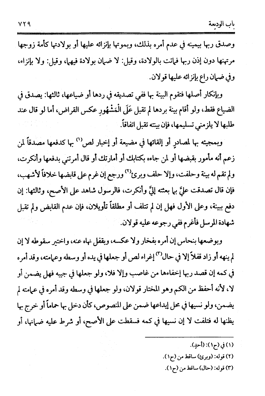وبإنكار أصلها فتقوم البينة بها ففي تصديقه في ردها أو ضياعها، ثالثها: يصدق في الضياع فقط، ولو أقام بينة بردها لم تقبل عَلَى الْمَشْهُورِ عكس القراض، أما لو قال عند طلبها لا يلزمني تسليمها، فإن بينته تقبل اتفاقاً.