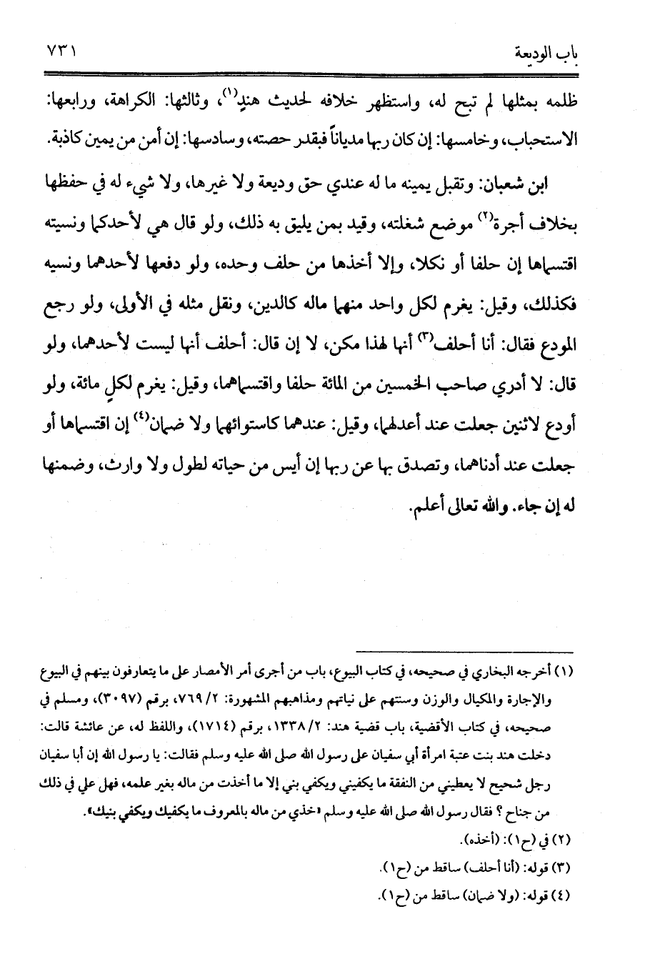 ابن شعبان: وتقبل يمينه ما له عندي حق وديعة ولا غيرها، ولا شيء له في حفظها بخلاف أجرة (¬1) موضع شغلته، وقيد بمن يليق به ذلك، ولو قال هي لأحدكما ونسيته اقتسماها إن حلفا أو نكلا، وإلا أخذها من حلف وحده، ولو دفعها لأحدهما ونسيه فكذلك، وقيل: يغرم لكل واحد منهما ماله كالدين، ونقل مثله في الأولى، ولو رجع المودع فقال: أنا أحلف (¬2) أنها لهذا مكن، لا إن قال: أحلف أنها ليست لأحدهما، ولو قال: لا أدري صاحب الخمسين من المائة حلفا واقتسماهما، وقيل: يغرم لكلٍ مائة، ولو أودع لاثنين جعلت عند أعدلهما، وقيل: عندهما كاستوائهما ولا ضمان (¬3) إن اقتسماها أو جعلت عند أدناهما، وتصدق بها عن ربها إن أيس من حياته لطول ولا وارث، وضمنها له إن جاء. والله تعالى أعلم.