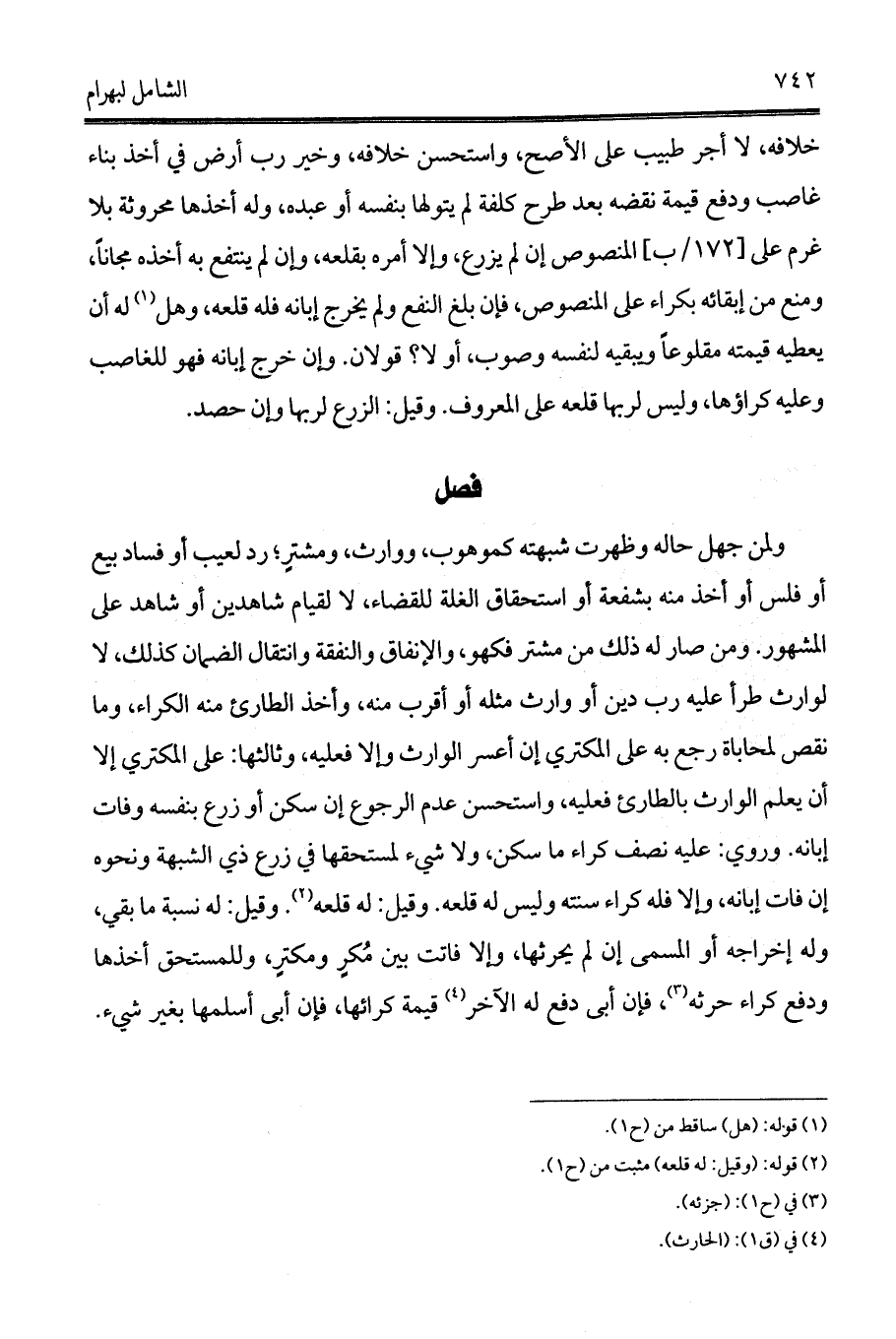 ولمن جهل حاله وظهرت شبهته كموهوب، ووارث، ومشترٍ؛ رد لعيب أو فساد بيع أو فلس أو أخذ منه بشفعة أو استحقاق الغلة للقضاء، لا لقيام شاهدين أو شاهد على المشهور. ومن صار له ذلك من مشتر فكهو، والإنفاق والنفقة وانتقال الضمان كذلك، لا لوارث طرأ عليه رب دين أو وارث مثله أو أقرب منه، وأخذ الطارئ منه الكراء، وما نقص لمحاباة رجع به على المكتري إن أعسر الوارث وإلا فعليه، وثالثها: على المكتري إلا أن يعلم الوارث بالطارئ فعليه، واستحسن عدم الرجوع إن سكن أو زرع بنفسه وفات إبانه. وروي: عليه نصف كراء ما سكن، ولا شيء لمستحقها في زرع ذي الشبهة ونحوه إن فات إبانه، وإلا فله كراء سنته وليس له قلعه. وقيل: له قلعه (¬2). وقيل: له نسبة ما بقي، وله إخراجه أو المسمى إن لم يحرثها، وإلا فاتت بين مُكرٍ ومكترٍ، وللمستحق أخذها ودفع كراء حرثه (¬3)، فإن أبى دفع له الآخر (¬4) قيمة كرائها، فإن أبى أسلمها بغير شيء.