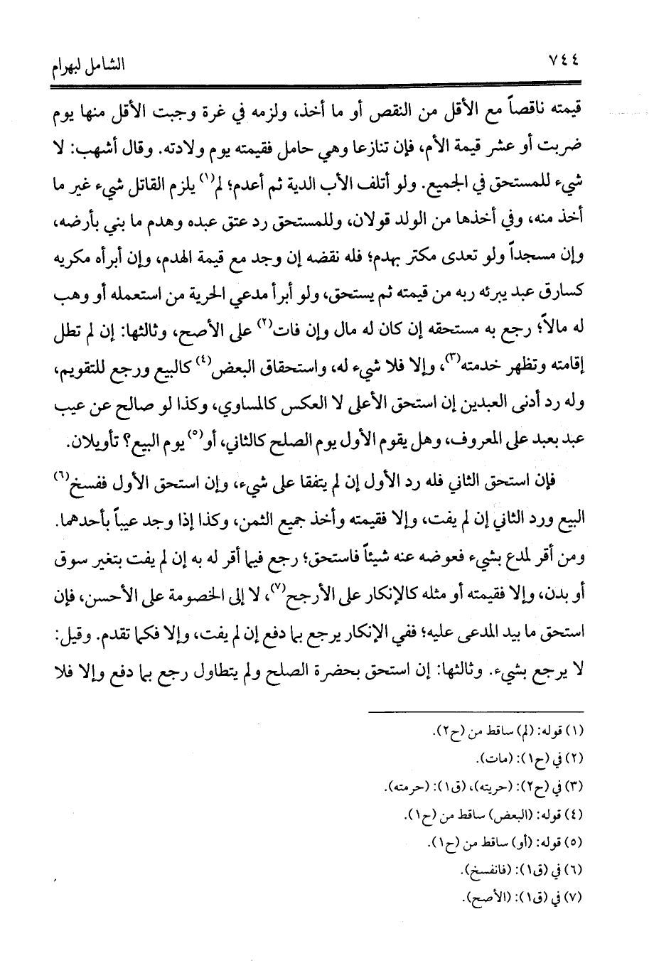 قيمته ناقصاً مع الأقل من النقص أو ما أخذ، ولزمه في غرة وجبت الأقل منها يوم ضربت أو عشر قيمة الأم، فإن تنازعا وهي حامل فقيمته يوم ولادته. وقال أشهب: لا شيء للمستحق في الجميع. ولو أتلف الأب الدية ثم أعدم؛ لم (¬1) يلزم القاتل شيء غير ما أخذ منه، وفي أخذها من الولد قولان، وللمستحق رد عتق عبده وهدم ما بني بأرضه، وإن مسجداً ولو تعدى مكتر بهدم؛ فله نقضه إن وجد مع قيمة الهدم، وإن أبرأه مكريه كسارق عبد يبرئه ربه من قيمته ثم يستحق، ولو أبرأ مدعي الحرية من استعمله أو وهب له مالاً؛ رجع به مستحقه إن كان له مال وإن فات (¬2)