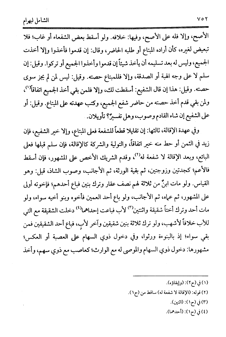 وفي عهدة الإقالة، ثالثها: إن تقايلا قطعاً للشفعة فعلى المبتاع، وإلا خير الشفيع، فإن زيد في الثمن أو حط منه خير اتفاقاً، والتولية والشركة كالإقالة، فإن سلم قبلها فعلى البائع، وبعد الإقالة لا شفعة له (2)، وقدم الشريك الأخص على المشهور، فإن أسقط فالأعم؛ كجدتين وزوجتين، ثم بقية الورثة، ثم الأجانب، وصوب الشاذ، قيل: وهو القياس. ولو مات ابنٌ من ثلاثة لهم نصف عقار وترك بنين فباع أحدهم؛ فإخوته أولى على المشهور، ثم عماه، ثم الأجانب، ولو باع أحد العمين فأخوه وبنو أخيه سواء، ولو مات أحد وترك أختاً شقيقة واثنتين (3) لأب فباعت إحداهما (4) دخلت الشقيقة مع التي للأب خلافاً لأشهب، ولو ترك ثلاثة بنين شقيقين وآخر لأبٍ، فباع أحد الشقيقين فمن بقي سواء؛ إذ بالبنوءة ورثوا، وفي دخول ذوي السهام على العصبة أو العكس؛ مشهورها: دخول ذوي السهام والموصى له مع الوارث؛ كعاصب مع ذوي سهم، وأخذ