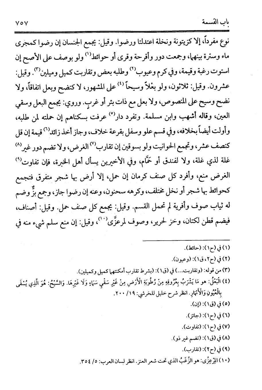 نوع مفرداً، إلا كزيتونة ونخلة اعتدلتا ورضوا. وقيل: يجمع الجنسان إن رضوا كمجرى ماء وسترة بينهما، وجمعت دور وأقرحة وقرى أو حوائط (¬1) ولو بوصف على الأصح إن استوت رغبة وقيمة، وفي كرم وعيوب (¬2) وطلبه بعض وتقاربت كميل وميلين (¬3). وقيل: عشرون. وقيل: ثلاثون، ولو بعْلاً وسيحاً (¬4) على المشهور، لا كنضح وبعل اتفاقاً، ولا نضح وسيح على المنصوص، ولا بعل مع ذات بئر أو غربٍ. وروي: يجمع البعل وسقي العين، وقاله أشهب وابن مسلمة. وتفرد دار (¬5) عرفت بسكناهم إن حملته لمن طلبه، وأولت أيضاً بخلافه، وفي قسم علو وسفل بقرعة خلاف، وجاز أخذ زائد (¬6) قيمة إن قل كنصف عشر، وتجمع الحوانيت ولو بسوقين إن تقارب (¬7) الغرض، ولا تضم دور غير (¬8) غلة لذي غلة، ولا لفندق أو حَمَّام، وفي الأخيرين يسأل أهل الخبرة، فإن تفاوت (¬9) الغرض منع، وأفرد كل صنف كرمان إن حمل، إلا أرض بها شجر متفرق فتجمع كحوائط بها شجر أو نخل مختلف، وكرهه سحنون، وعنه إن رضوا جاز، وجمع بزٌّ وضم له ثياب صوف وأفرية لم تحمل القسم. وقيل: يجمع كل صنف حمل. وقيل: أصناف، فيضم قطن لكتان، وخز لحرير، وصوف لمرعزَّى (¬10)، وقيل: إن منع سلم شيء منه في