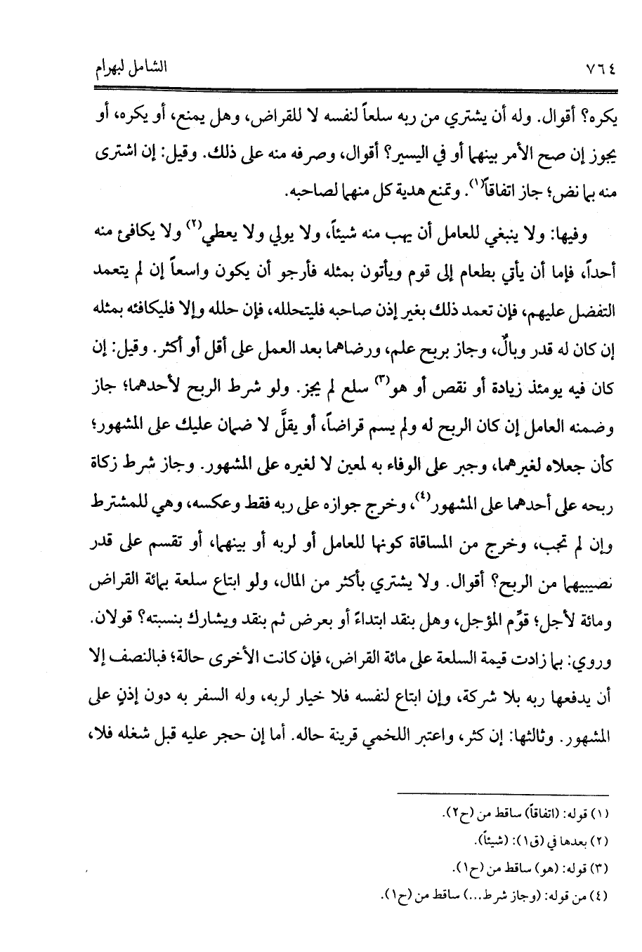 وفيها: ولا ينبغي للعامل أن يهب منه شيئاً، ولا يولي ولا يعطي (¬1) ولا يكافئ منه أحداً، فإما أن يأتي بطعام إلى قوم ويأتون بمثله فأرجو أن يكون واسعاً إن لم يتعمد التفضل عليهم، فإن تعمد ذلك بغير إذن صاحبه فليتحلله، فإن حلله وإلا فليكافئه بمثله إن كان له قدر وبالٌ، وجاز بربح علم، ورضاهما بعد العمل على أقل أو أكثر. وقيل: إن كان فيه يومئذ زيادة أو نقص أو هو (¬2) سلع لم يجز. ولو شرط الربح لأحدهما؛ جاز وضمنه العامل إن كان الربح له ولم يسم قراضاً، أو يقلَّ لا ضمان عليك على المشهور؛ كأن جعلاه لغيرهما، وجبر على الوفاء به لمعين لا لغيره على المشهور. وجاز شرط زكاة ربحه على أحدهما على المشهور (¬3)، وخرج جوازه على ربه فقط وعكسه، وهي للمشترط وإن لم تجب، وخرج من المساقاة كونها للعامل أو لربه أو بينهما، أو تقسم على قدر نصيبيهما من الربح؟ أقوال. ولا يشتري بأكثر من المال، ولو ابتاع سلعة بمائة القراض ومائة لأجل؛ قوِّم المؤجل، وهل بنقد ابتداءً أو بعرض ثم بنقد ويشارك بنسبته؟ قولان. وروي: بما زادت قيمة السلعة على مائة القراض، فإن كانت الأخرى حالة؛ فبالنصف إلا أن يدفعها ربه بلا شركة، وإن ابتاع لنفسه فلا خيار لربه، وله السفر به دون إذنٍ على المشهور. وثالثها: إن كثر، واعتبر اللخمي قرينة حاله. أما إن حجر عليه قبل شغله فلا،