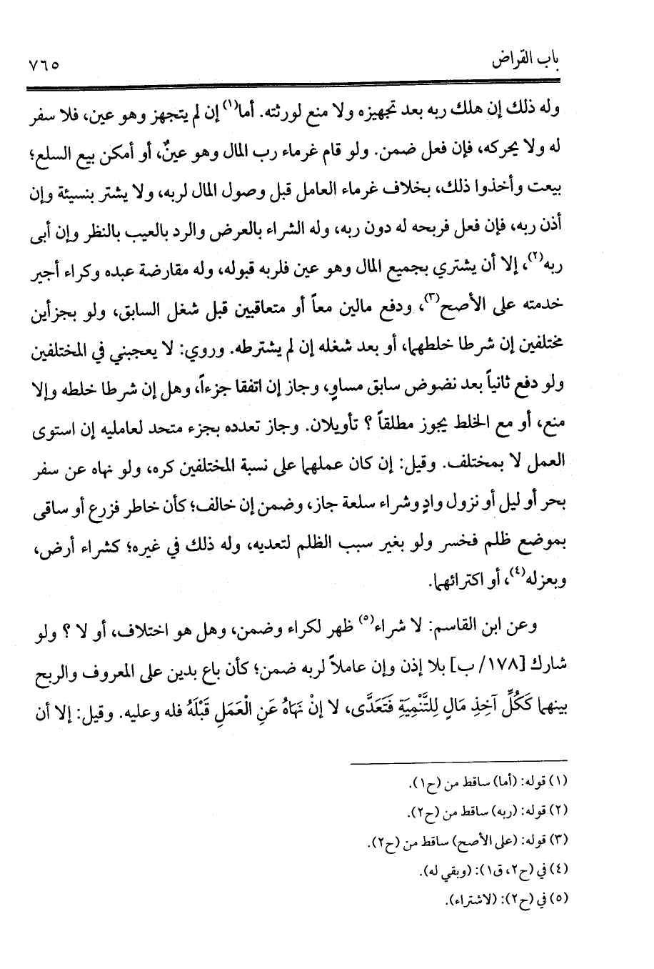ولو قام غرماء رب المال وهو عينٌ، أو أمكن بيع السلع؛ بيعت وأخذوا ذلك، بخلاف غرماء العامل قبل وصول المال لربه، ولا يشتر بنسيئة وإن أذن ربه، فإن فعل فربحه له دون ربه، وله الشراء بالعرض والرد بالعيب بالنظر وإن أبى ربه (¬1)، إلا أن يشتري بجميع المال وهو عين فلربه قبوله، وله مقارضة عبده وكراء أجير خدمته على الأصح (¬2)، ودفع مالين معاً أو متعاقبين قبل شغل السابق، ولو بجزأين مختلفين إن شرطا خلطهما، أو بعد شغله إن لم يشترطه. وروي: لا يعجبني في المختلفين ولو دفع ثانياً بعد نضوض سابق مساوٍ، وجاز إن اتفقا جزءاً، وهل إن شرطا خلطه وإلا منع، أو مع الخلط يجوز مطلقاً؟ تأويلان. وجاز تعدده بجزء متحد لعامليه إن استوى العمل لا بمختلف. وقيل: إن كان عملهما على نسبة المختلفين كره، ولو نهاه عن سفر بحر أو ليل أو نزول وادٍ وشراء سلعة جاز، وضمن إن خالف؛ كأن خاطر فزرع أو ساقى بموضع ظلم فخسر ولو بغير سبب الظلم لتعديه، وله ذلك في غيره؛ كشراء أرض، وبعزله (¬3)، أو اكترائهما.