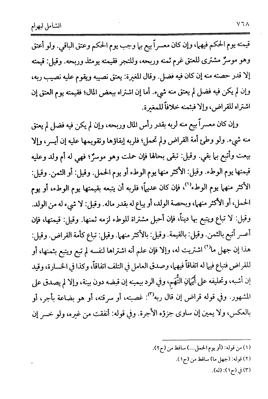 وإن كان معسراً بيع منه لربه بقدر رأس المال وربحه، وإن لم يكن فيه فضل لم يعتق منه شيء. ولو وطئ أمة القراض ولم تحمل؛ فلربه إبقاؤها وتقويمها عليه إن أيسر، وإلا بيعت وأتبع بما بقي. وقيل: تبقى بحالها فإن حملت وهو موسرٌ؛ فهي له أم ولد وعليه قيمتها يوم الوطء. وقيل: الأكثر منها يوم الوطء أو يوم الحمل. وقيل: أو الثمن. وقيل: الأكثر منهما يوم الوطء (¬1)، فإن كان عديماً؛ فلربه أن يتبعه بقيمتها يوم الوطء، أو يوم الحمل، أو الأكثر منهما، وبحصة الولد، أو يباع له بقدر ماله. وقيل: لا شيء له من الولد. وقيل: لا تباع ويتبع بها ديناً، فإن أحبل مشتراة للوطء لزمه ثمنها. وقيل: قيمتها، فإن أعسر أتبع بالثمن. وقيل: بالقيمة. وقيل: بالأكثر منهما. وقيل: تباع كأمة القراض. وقيل: هذا إن جهل ما (¬2) اشتريت له، وإلا فإن علم أنه اشتراها لنفسه لم تبع ويتبع بثمنها، أو للقراض فتباع فيما له اتفاقاً فيهما، وصدق العامل في التلف اتفاقاً، وكذا في الخسارة، وقيد إن أشبه، وتحليفه على أَيْمَانِ التُّهَمِ، وفي الرد بيمينه إن قبضه دون بينة، وإلا لم يصدق على المشهور. وفي قوله قراض إن قال ربه (¬3): غصبته، أو سرقته، أو هو بضاعة بأجر، أو بالعكس، ولا يمين إن ساوى جزؤه الأجرة. وفي قوله: أنفقت من غيره، ولو خسر إن