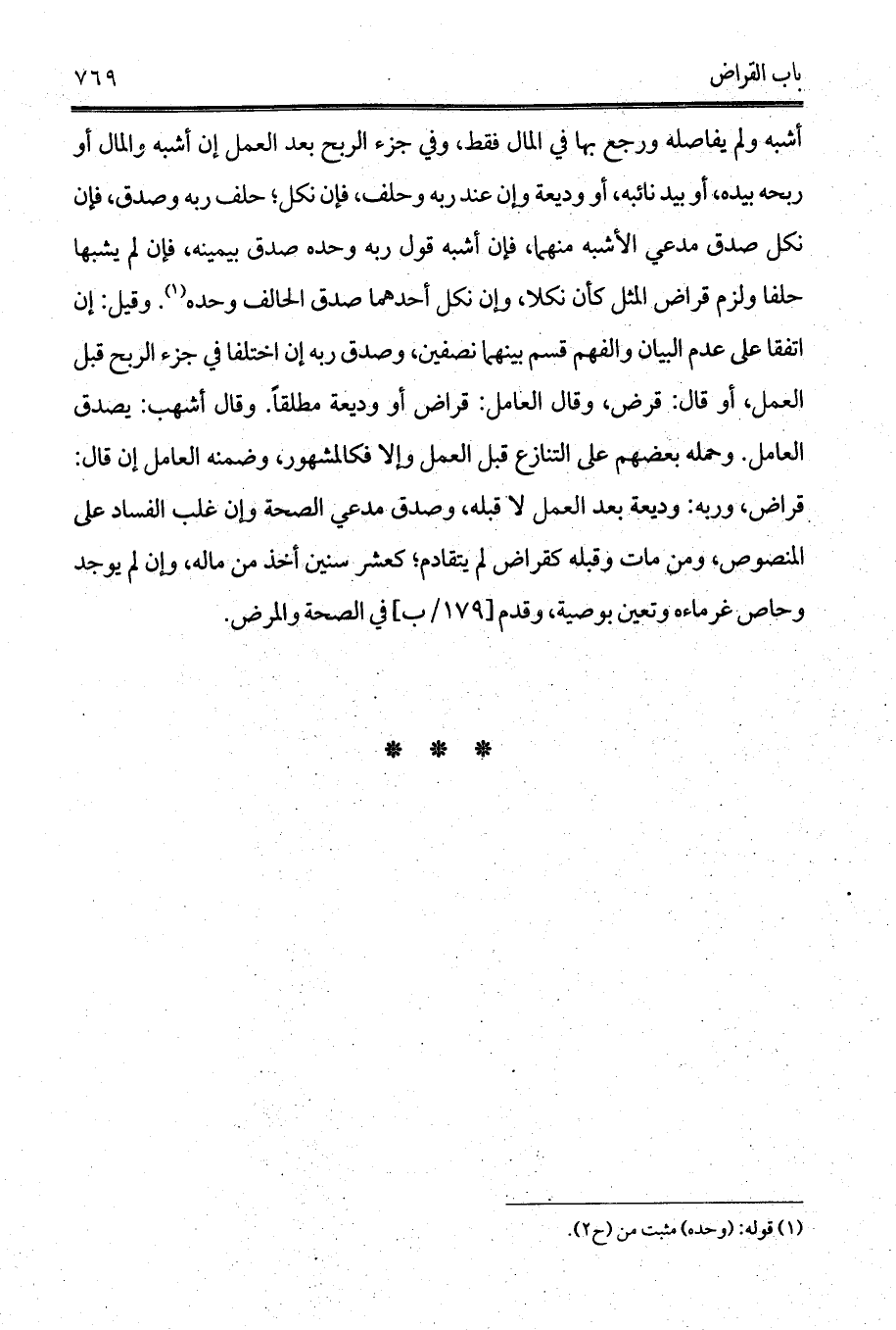 وقيل: إن اتفقا على عدم البيان والفهم قسم بينهما نصفين، وصدق ربه إن اختلفا في جزء الربح قبل العمل، أو قال: قرض، وقال العامل: قراض أو وديعة مطلقاً. وقال أشهب: يصدق العامل. وحمله بعضهم على التنازع قبل العمل وإلا فكالمشهور، وضمنه العامل إن قال: قراض، وربه: وديعة بعد العمل لا قبله، وصدق مدعي الصحة وإن غلب الفساد على المنصوص، ومن مات وقبله كقراض لم يتقادم؛ كعشر سنين أخذ من ماله، وإن لم يوجد وحاص غرماءه وتعين بوصية، وقدم [أ/179] في الصحة والمرض.