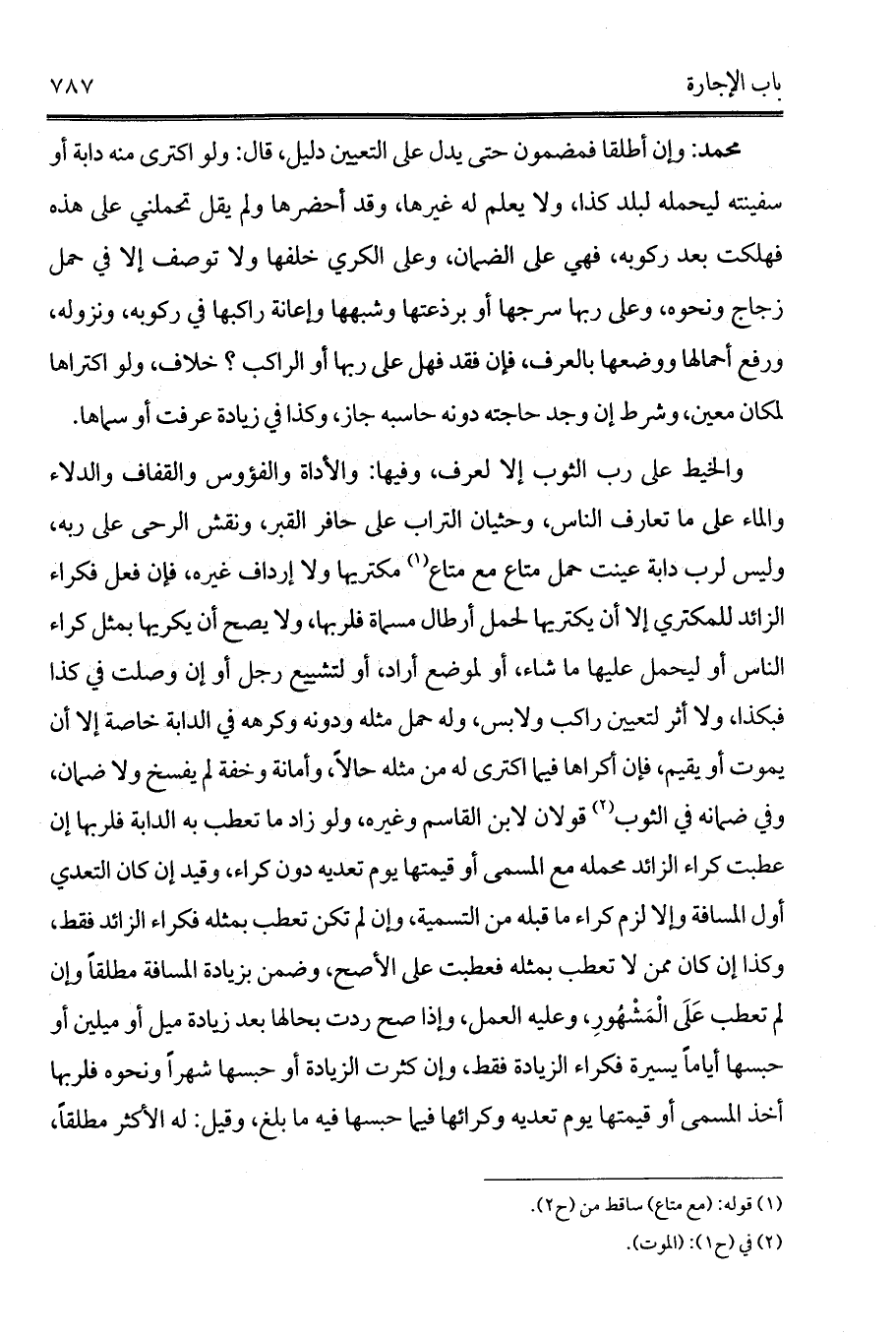 محمد: وإن أطلقا فمضمون حتى يدل على التعيين دليل، قال: ولو اكترى منه دابة أو سفينته ليحمله لبلد كذا، ولا يعلم له غيرها، وقد أحضرها ولم يقل تحملني على هذه فهلكت بعد ركوبه، فهي على الضمان، وعلى الكري خلفها ولا توصف إلا في حمل زجاج ونحوه، وعلى ربها سرجها أو برذعتها وشبهها وإعانة راكبها في ركوبه، ونزوله، ورفع أحمالها ووضعها بالعرف، فإن فقد فهل على ربها أو الراكب؟ خلاف، ولو اكتراها لمكان معين، وشرط إن وجد حاجته دونه حاسبه جاز، وكذا في زيادة عرفت أو سماها.