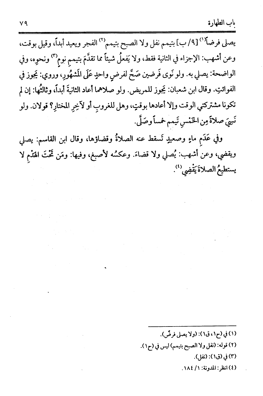 وفي عَدَمِ ماءٍ وصعيدٍ تَسقط عنه الصلاةُ وقضاؤها، وقال ابن القاسم: يصلي ويقضي، وعن أشهب: يُصلي ولا قضاءَ. وعكسُه لأصبغ، وفيها: ومَن تَحْتَ الهَدْمِ لا يستطيعُ الصلاةَ يَقْضِي (¬4).
