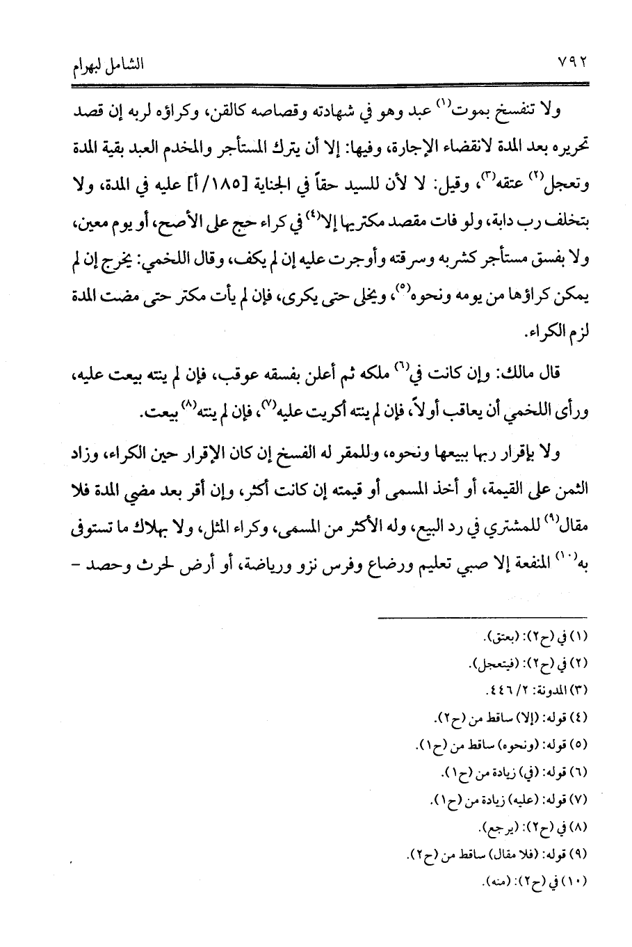 ولا تنفسخ بموت (¬1) عبد وهو في شهادته وقصاصه كالقن، وكراؤه لربه إن قصد تحريره بعد المدة لانقضاء الإجارة، وفيها: إلا أن يترك المستأجر والمخدم العبد بقية المدة وتعجل (¬2) عتقه (¬3)، وقيل: لا لأن للسيد حقاً في الجناية [ب/184] عليه في المدة، ولا بتخلف رب دابة، ولو فات مقصد مكتريها إلا (¬4) في كراء حج على الأصح، أو يوم معين، ولا بفسق مستأجر كشربه وسرقته وأوجرت عليه إن لم يكف، وقال اللخمي: يخرج إن لم يمكن كراؤها من يومه ونحوه (¬5)، ويخلى حتى يكرى، فإن لم يأت مكتر حتى مضت المدة لزم الكراء.