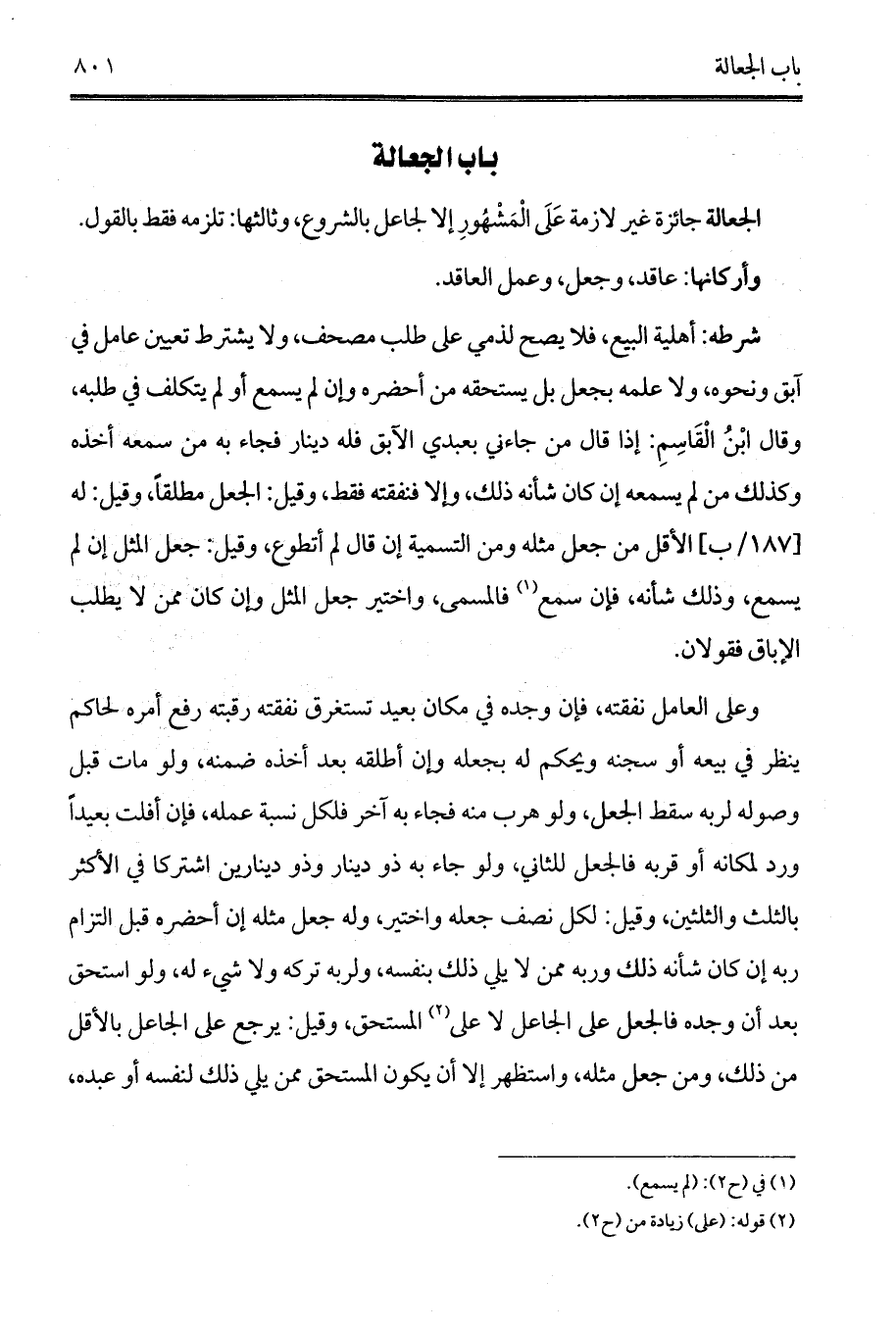 الجعالة جائزة غير لازمة عَلَى الْمَشْهُورِ إلا لجاعل بالشروع، وثالثها: تلزمه فقط بالقول.