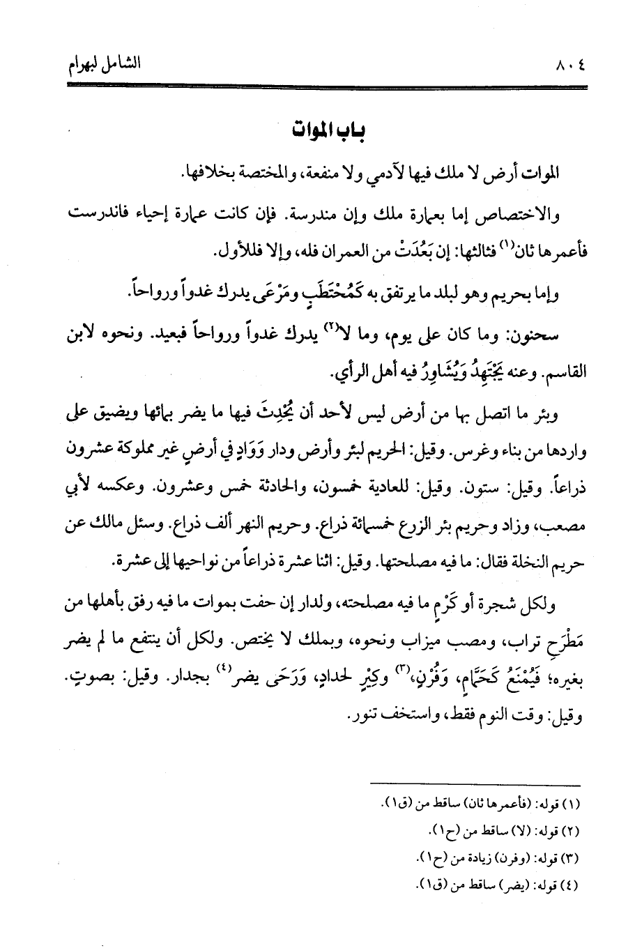 وبئر ما اتصل بها من أرض ليس لأحد أن يُحْدِثَ فيها ما يضر بمائها ويضيق على واردها من بناء وغرس. وقيل: الحريم لبئر وأرض ودار وَوَادٍ في أرضٍ غير مملوكة عشرون ذراعاً. وقيل: ستون. وقيل: للعادية خمسون، والحادثة خمس وعشرون. وعكسه لأبي مصعب، وزاد وحريم بئر الزرع خمسمائة ذراع. وحريم النهر ألف ذراع. وسئل مالك عن حريم النخلة فقال: ما فيه مصلحتها. وقيل: اثنا عشرة ذراعاً من نواحيها إلى عشرة.