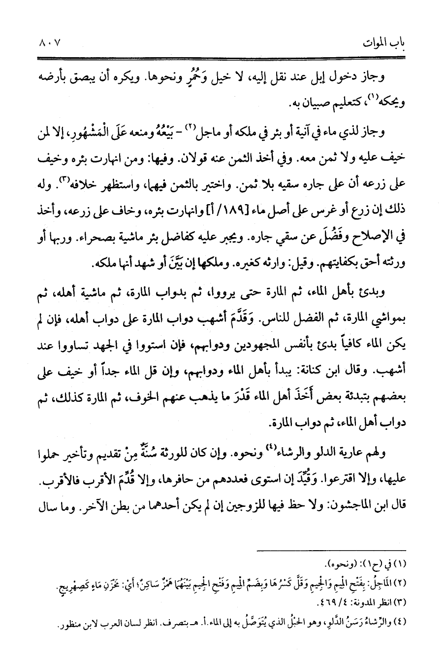وبدئ بأهل الماء، ثم المارة حتى يرووا، ثم بدواب المارة، ثم ماشية أهله، ثم بمواشي المارة، ثم الفضل للناس. وَقَدَّمَ أشهب دواب المارة على دواب أهله، فإن لم يكن الماء كافياً بدئ بأنفس المجهودين ودوابهم، فإن استووا في الجهد تساووا عند أشهب. وقال ابن كنانة: يبدأ بأهل الماء ودوابهم، وإن قل الماء جداً أو خيف على بعضهم بتبدئة بعض أَخَذَ أهل الماء قَدْرَ ما يذهب عنهم الخوف، ثم المارة كذلك، ثم دواب أهل الماء، ثم دواب المارة.