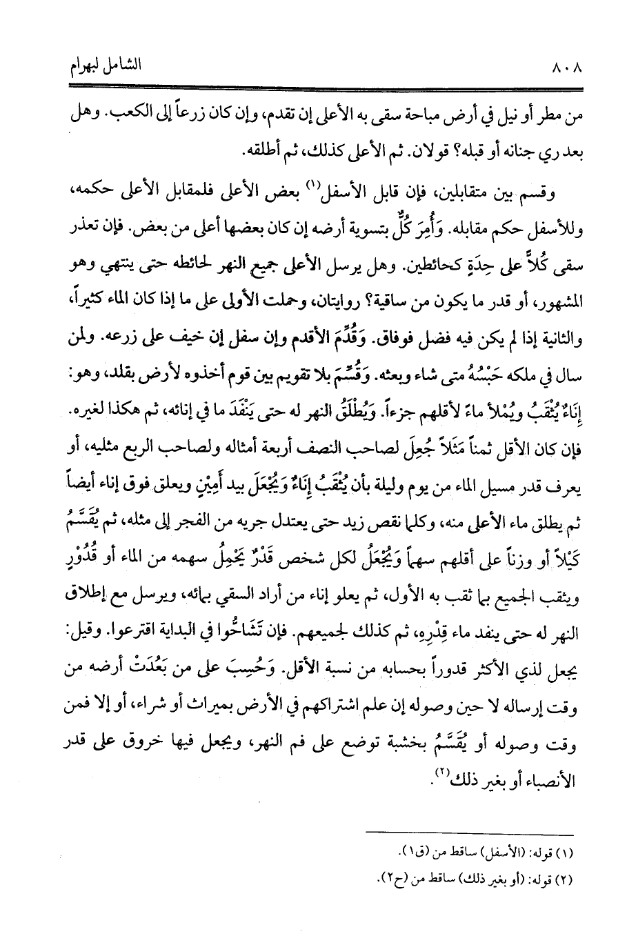 وقسم بين متقابلين، فإن قابل الأسفل (¬1) بعض الأعلى فلمقابل الأعلى حكمه، وللأسفل حكم مقابله. وَأُمِرَ كُلٌّ بتسوية أرضه إن كان بعضها أعلى من بعض. فإن تعذر سقى كُلاًّ على حِدَةٍ كحائطين. وهل يرسل الأعلى جميع النهر لحائطه حتى ينتهي وهو المشهور، أو قدر ما يكون من ساقية؟ روايتان، وحملت الأولى على ما إذا كان الماء كثيراً، والثانية إذا لم يكن فيه فضل فوفاق. وَقُدِّمَ الأقدم وإن سفل إن خيف على زرعه. ولمن سال في ملكه حَبْسُهُ متى شاء وبعثه. وَقُسِّمَ بلا تقويم بين قوم أخذوه لأرض بقلد، وهو: إِنَاءٌ يُثْقَبُ ويُمْلأ ماءً لأقلهم جزءاً. وَيُطْلَقُ النهر له حتى يَنْفَدَ ما في إنائه، ثم هكذا لغيره. فإن كان الأقل ثمناً مَثَلاً جُعِلَ لصاحب النصف أربعة أمثاله ولصاحب الربع مثليه، أو يعرف قدر مسيل الماء من يوم وليلة بأن يُثْقَبُ إِنَاءٌ وَيُجْعَلَ بيد أَمِيْنٍ ويعلق فوق إناء أيضاً ثم يطلق ماء الأعلى منه، وكلما نقص زيد حتى يعتدل جريه من الفجر إلى مثله، ثم يُقَسَّمُ كَيْلاً أو وزناً على أقلهم سهماً وَيُجْعَلُ لكل شخص قَدْرٌ يَحْمِلُ سهمه من الماء أو قُدُوْرٍ ويثقب الجميع بما ثقب به الأول، ثم يعلو إناء من أراد السقي بمائه، ويرسل مع إطلاق النهر له حتى ينفد ماء قِدْرِهِ، ثم كذلك لجميعهم. فإن تَشَاحُّوا في البداية اقترعوا. وقيل: يجعل لذي الأكثر قدوراً بحسابه من نسبة الأقل. وَحُسِبَ على من بَعُدَتْ أرضه من وقت إرساله لا حين وصوله إن علم اشتراكهم في الأرض بميراث أو شراء، أو إلا فمن وقت وصوله أو يُقَسَّمُ بخشبة توضع على فم النهر، ويجعل فيها خروق على قدر الأنصباء أو بغير ذلك (¬2).