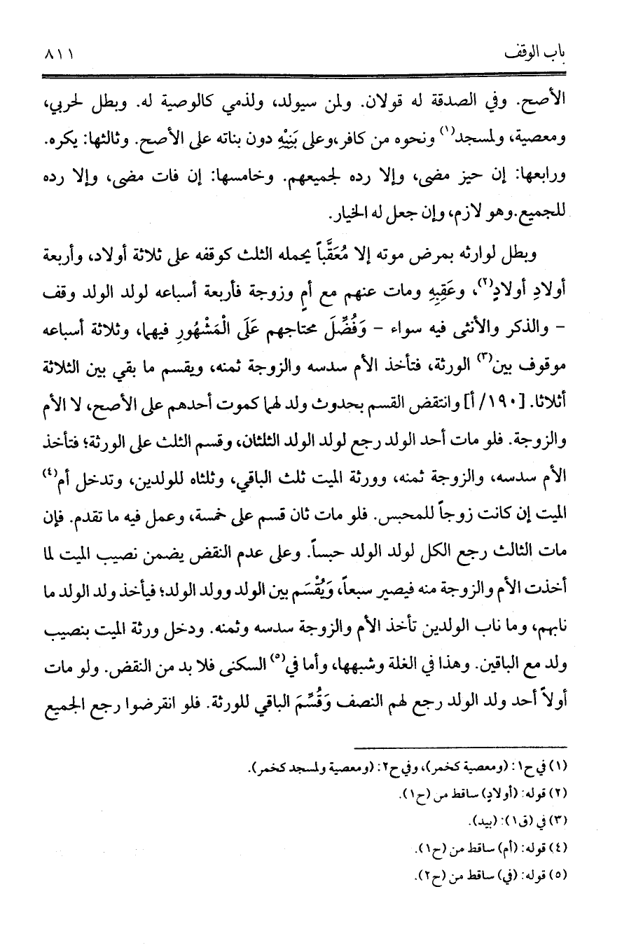 وبطل لوارثه بمرض موته إلا مُعَقَّباً يحمله الثلث كوقفه على ثلاثة أولاد، وأربعة أولادِ أولادٍ (¬2)، وعَقِبِهِ ومات عنهم مع أمٍ وزوجة فأربعة أسباعه لولد الولد وقف - والذكر والأنثى فيه سواء - وَفُضِّلَ محتاجهم عَلَى الْمَشْهُورِ فيهما، وثلاثة أسباعه موقوف بين (3) الورثة، فتأخذ الأم سدسه والزوجة ثمنه، ويقسم ما بقي بين الثلاثة أثلاثا. [ب/189] وانتقض القسم بحدوث ولد لهما كموت أحدهم على الأصح، لا الأم والزوجة. فلو مات أحد الولد رجع لولد الولد الثلثان، وقسم الثلث على الورثة؛ فتأخذ الأم سدسه، والزوجة ثمنه، وورثة الميت ثلث الباقي، وثلثاه للولدين، وتدخل أم (4) الميت إن كانت زوجاً للمحبس. فلو مات ثان قسم على خمسة، وعمل فيه ما تقدم. فإن مات الثالث رجع الكل لولد الولد حبساً. وعلى عدم النقض يضمن نصيب الميت لما أخذت الأم والزوجة منه فيصير سبعاً، وَيُقْسَم بين الولد وولد الولد؛ فيأخذ ولد الولد ما نابهم، وما ناب الولدين تأخذ الأم والزوجة سدسه وثمنه. ودخل ورثة الميت بنصيب ولد مع الباقين. وهذا في الغلة وشبهها، وأما في (5) السكنى فلا بد من النقض. ولو مات أولاً أحد ولد الولد رجع لهم النصف وَقُسِّمَ الباقي للورثة. فلو انقرضوا رجع الجميع