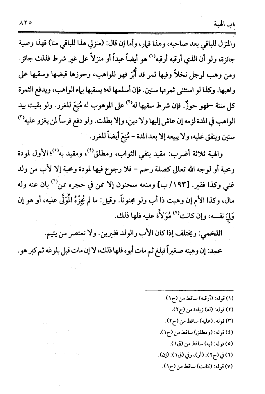 والمنزل للباقي بعد صاحبه، وهذا قمار، وأما إن قال: (منزلي هذا للباقي منا) فهذا وصية جائزة، ولو أن الذي أرقبه أرقبه (1) هو أيضاً عبداً أو منزلاً على غير شرط فذلك جائز. ومن وهب لرجل نخلاً وفيها ثمر قد أُبِّرَ فهو للواهب، وحوزها قبضها وسقيها على واهبها. وكذا لو استثنى ثمرتها سنين. فإن أسلمها له؛ يسقيها بماء الواهب، ويدفع الثمرة كل سنة -فهو حوزٌ. فإن شرط سقيها له (2) على الموهوب له مُنِعَ للغرر. ولو بقيت بيد الواهب في المدة لزمه إن عاش إليها ولا دين، وإلا بطلت. ولو دفع فرساً لمن يغزو عليه (3) سنين وينفق عليه، ولا يبيعه إلا بعد المدة -مُنِعَ أيضاً للغرر.