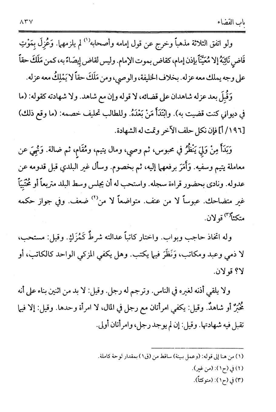 وله اتخاذ حاجب وبواب. واختار كاتباً عدالته شرطٌ كَمُزَكٍ. وقيل: مستحب، لا ذمي وعبد ومكاتب، وَنَظَرَ فيما يكتب. وهل يكفي المزكي الواحد كالكاتب، أو لا؟ قولان.