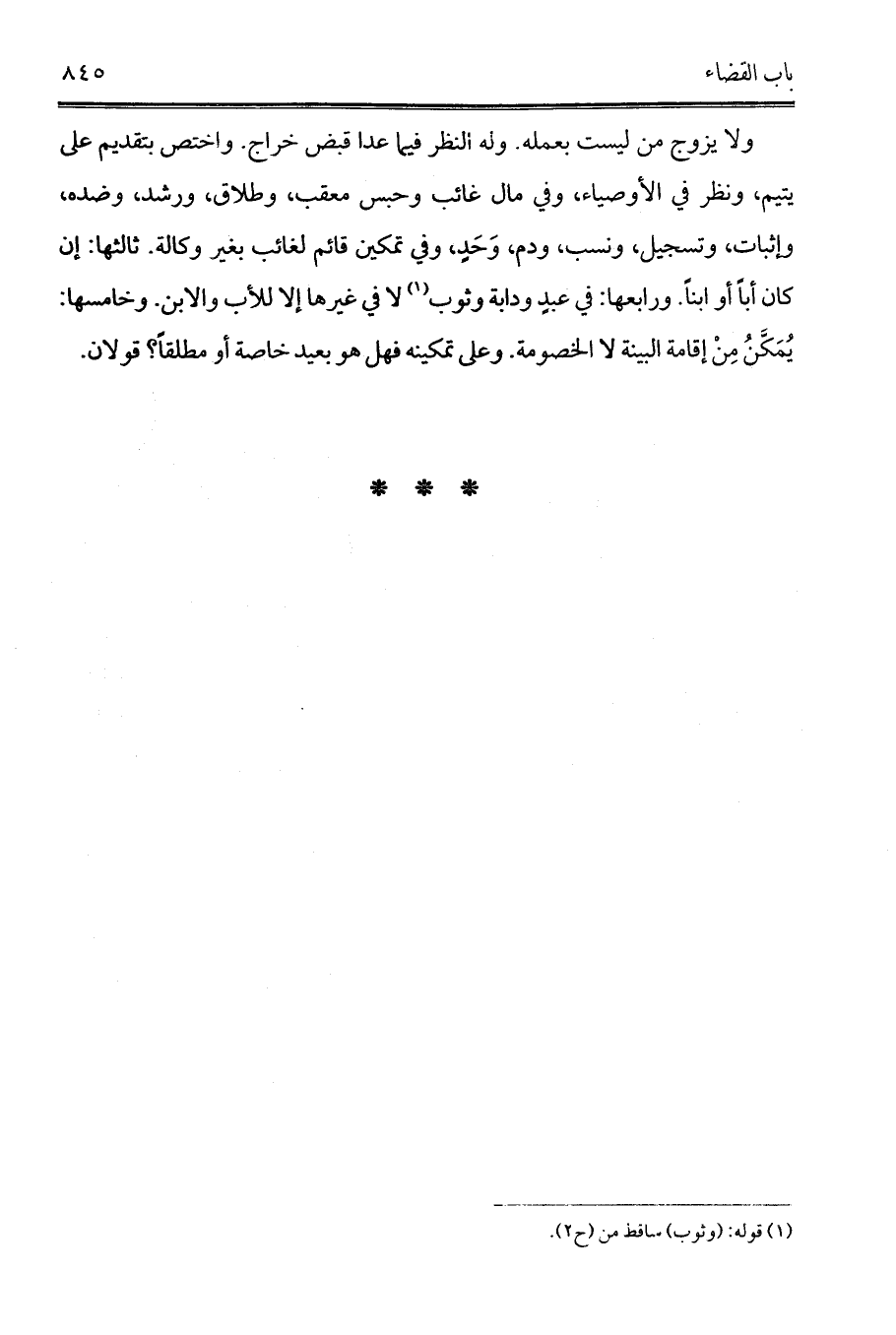 ولا يزوج من ليست بعمله. وله النظر فيما عدا قبض خراج. واختص بتقديم على يتيم، ونظر في الأوصياء، وفي مال غائب وحبس معقب، وطلاق، ورشد، وضده، وإثبات، وتسجيل، ونسب، ودم، وَحَدٍ، وفي تمكين قائم لغائب بغير وكالة. ثالثها: إن كان أباً أو ابناً. ورابعها: في عبدٍ ودابة وثوب (¬1) لا في غيرها إلا للأب والابن. وخامسها: يُمَكَّنُ مِنْ إقامة البينة لا الخصومة. وعلى تمكينه فهل هو بعيد خاصة أو مطلقاً؟ قولان.