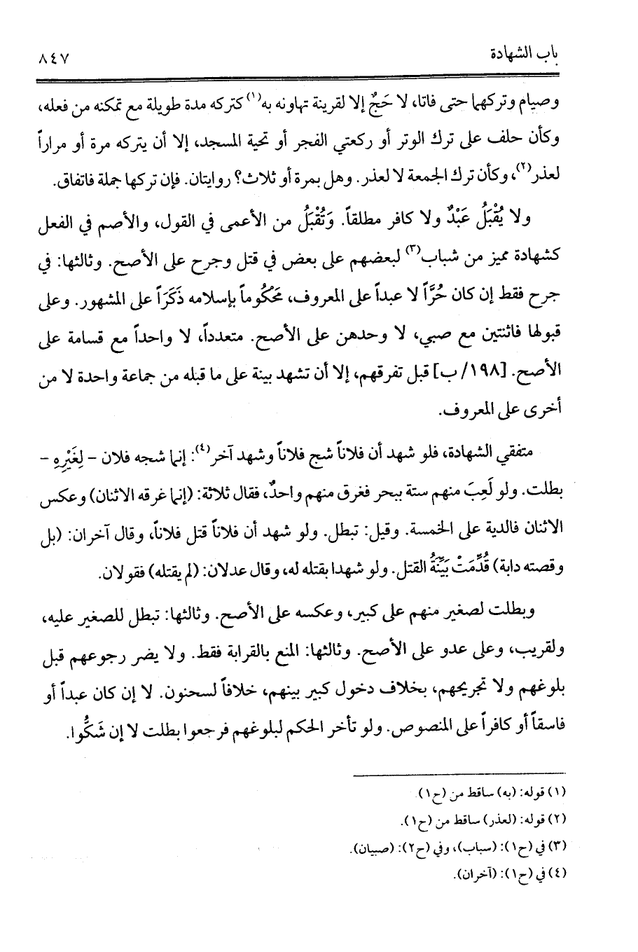 ولا يُقْبَلُ عَبْدٌ ولا كافر مطلقاً. وَتُقْبَلُ من الأعمى في القول، والأصم في الفعل كشهادة مميز من شباب (¬4) لبعضهم على بعض في قتل وجرح على الأصح. وثالثها: في جرح فقط إن كان حُرَّاً لا عبداً على المعروف، مَحْكُوماً بإسلامه ذَكَرَاً على المشهور. وعلى قبولها فاثنتين مع صبي، لا وحدهن على الأصح. متعدداً، لا واحداً مع قسامة على الأصح. [أ/198] قبل تفرقهم، إلا أن تشهد بينة على ما قبله من جماعة واحدة لا من أخرى على المعروف.