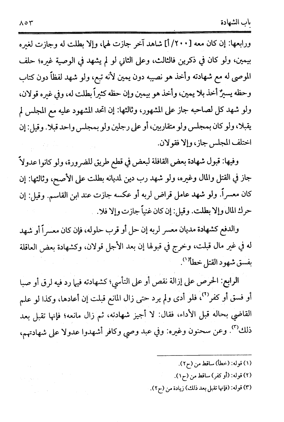 ورابعها: إن كان معه [ب/199] شاهد آخر جازت لهما، وإلا بطلت له وجازت لغيره بيمين، ولو كان في ذكرين فالثالث، وعلى الثاني لو لم يشهد في الوصية غيره؛ حلف الموصى له مع شهادته وأخذ هو نصيبه دون يمين لأنه تبع، ولو شهد لفظاً دون كتاب وحظه يسيرٌ أخذ بلا يمين، وأخذ هو بيمين وإن حظه كثيراً بطلت له، وفي غيره قولان، ولو شهد كل لصاحبه جاز على المشهور، وثالثها: إن اتحد المشهود عليه مع المجلس لم يقبلا، ولو كان بمجلس ولو متقاربين، أو على رجلين ولو بمجلس واحد قبلا. وقيل: إن اختلف المجلس جاز، وإلا فقولان.