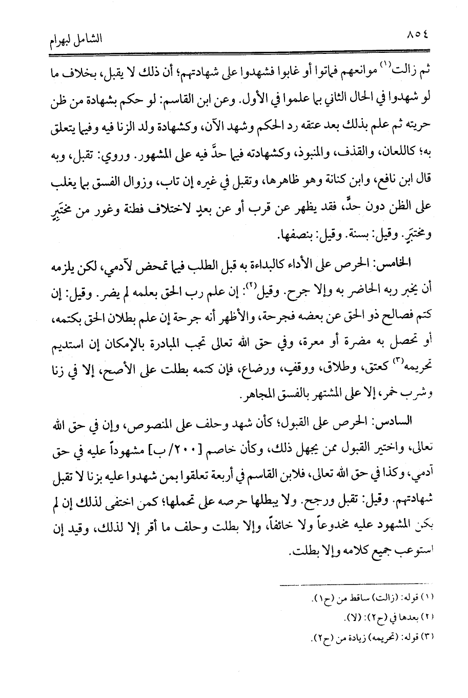 الخامس: الحرص على الأداء كالبداءة به قبل الطلب فيما تمحض لآدمي، لكن يلزمه أن يخبر ربه الحاضر به وإلا جرح. وقيل (2): إن علم رب الحق بعلمه لم يضر. وقيل: إن كتم فصالح ذو الحق عن بعضه فجرحة، والأظهر أنه جرحة إن علم بطلان الحق بكتمه، أو تحصل به مضرة أو معرة، وفي حق الله تعالى تجب المبادرة بالإمكان إن استديم تحريمه (3) كعتق، وطلاق، ووقفٍ، ورضاع، فإن كتمه بطلت على الأصح، إلا في زنا وشرب خمر، إلا على المشتهر بالفسق المجاهر.