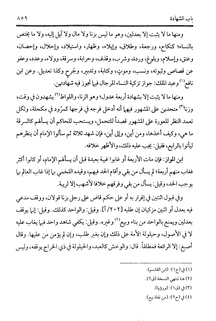 ومنها ما لا يثبت إلا بعدلين، وهو ما ليس بزنا ولا مال ولا آيل إليه، ولا ما يختص بالنساء؛ كنكاح، ورجعة، وطلاق، وإيلاء، وظهار، واستيلاد، وإحلال، وإحصان، وعتق، وإسلام، وبلوغ، وردة، وشرب، وقذف، وحرابة، وسرقة، وولاء، وعدد، وعفو عن قصاص وثبوته، ونسب، وموتٍ، وكتابة، وتدبير، وجَرحٍ وكذا تعديل. وعن ابن نافع (¬1) وعبد الملك: جواز تزكية النساء للرجال فيما تجوز فيه شهادتهن.