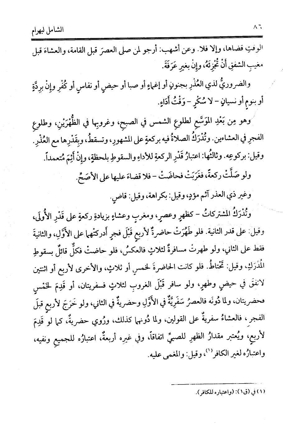 وتُدْرَكُ المشتركاتُ - كظهرٍ وعصرٍ، ومغربٍ وعشاءٍ بزيادةِ ركعةٍ على قَدْرِ الأُولَى، وقيل: على قدر الثانية. فلو طَهُرَتْ حاضرةٌ لأربعٍ قَبْلَ فجرٍ أَدركتْهما على الأَوَّلِ، والثانيةَ فقط على الثاني، ولو طهرتْ مسافرةٌ لثلاثٍ فالعكسُ، فلو حاضتْ فكلٌّ قائلٌ بسقوطِ المُدْرَكِ، وقيل: تَحْتاطُ. فلو كانت الحاضرةُ لخمسٍ أو ثلاثٍ، والأخرى لأربع أو اثنتين لاتفقَ في حيضٍ وطهرٍ، ولو سافر قَبْلَ الغروبِ لثلاثٍ فسفريتان، أو قَدِمَ لخَمْسٍ فحضريتان، ولما دُونَه فالعصرُ سَفَرِيَّةٌ في الأَوَّلِ وحضريةٌ في الثاني، ولو خَرَجَ لأربعٍ قبلَ الفجرِ، فالعشاءُ سفريةٌ على القولين، ولما دُونهما كذلك، ورُوي حضريةٌ، كما لو قَدِمَ لأربعٍ، ويُعتبر مقدارُ الظهرِ للصبيِّ اتفاقاً، وفي غيرِه أربعةٌ، اعتبارُه للجميعِ ونفيه، واعتبارُه لغير الكافر (¬1)، وقيل: والمغمى عليه.