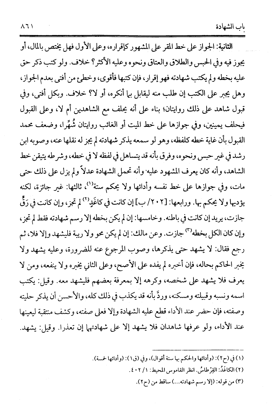 الثانية: الجواز على خط المقر على المشهور كإقراره، وعلى الأول فهل يختص بالمال، أو يجوز فيه وفي الحبس والطلاق والعتاق ونحوه وعليه الأكثر؟ خلاف. ولو كتب ذكر حق عليه بخطه ولم يكتب شهادته فهو إقرار، فإن كتبها فأقوى، وخطئ من أفتى بعدم الجواز، وهل يجبر على الكتب إن طلب منه ليقابل بما أنكره، أو لا؟ خلاف. وبكل أفتى، وفي قبول شاهد على ذلك روايتان؛ بناء على أنه يحلف مع الشاهدين أم لا، وعلى القبول فيحلف يمينين، وفي جوازها على خط الميت أو الغائب روايتان شُهِّرا، وضعف محمد القبول بأن غاية خطه كلفظه، وهو لو سمعه يذكر شهادته لم يجز له نقلها عنه، وصوبه ابن رشد في غير حبس ونحوه، وفرق بأنه قد يتساهل في لفظه لا في خطه، وشرطه يتيقن خط الشاهد، وأنه كان يعرف المشهود عليه، وأنه تحمل الشهادة عدلاً ولم يزل على ذلك حتى مات، وفي جوازها على خط نفسه وأدائها ولا يحكم ستة (¬1)، ثالثها: غير جائزة، لكنه يؤديها ولا يحكم بها. ورابعها: [أ/202] إن كانت في كاغَدٍ (¬2) لم تجز، وإن كانت في رَقٍّ جازت، يريد إن كانت في باطنه. وخامسها: إن لم يكن بخطه إلا رسم شهادته فقط لم تجز، وإن كان الكل بخطه (¬3) جازت. وعن مالك: إن لم يكن محو ولا ريبة فليشهد وإلا فلا، ثم رجع فقال: لا يشهد حتى يذكرها، وصوب المرجوع عنه للضرورة، وعليه يشهد ولا يخبر الحاكم بحاله، فإن أخبره لم يفده على الأصح، وعلى الثاني يخبره ولا ينفعه، ومن لا يعرف فلا يشهد على شخصه، وكرهه إلا بمعرفة بعضهم فليشهد معه.