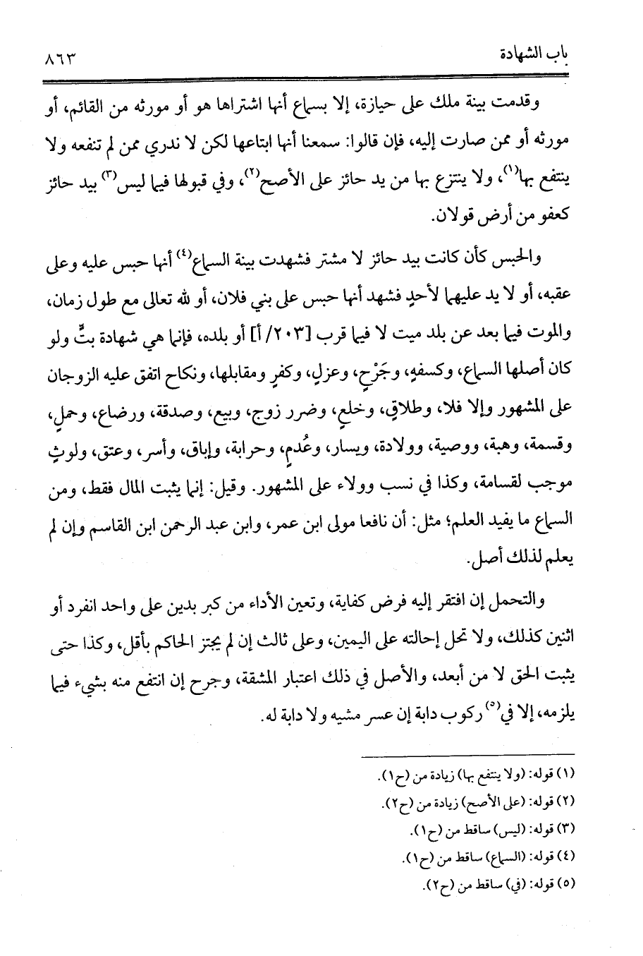 والحبس كأن كانت بيد حائز لا مشتر فشهدت بينة السماع (¬4) أنها حبس عليه وعلى عقبه، أو لا يد عليهما لأحدٍ فشهد أنها حبس على بني فلان، أو لله تعالى مع طول زمان، والموت فيما بعد عن بلد ميت لا فيما قرب [ب/202] أو بلده، فإنما هي شهادة بتٍّ ولو كان أصلها السماع، وكسفهٍ، وجَرْحٍ، وعزلٍ، وكفرٍ ومقابلها، ونكاح اتفق عليه الزوجان على المشهور وإلا فلا، وطلاقٍ، وخلعٍ، وضرر زوج، وبيع، وصدقة، ورضاع، وحملٍ، وقسمة، وهبة، ووصية، وولادة، ويسار، وعُدمٍ، وحرابة، وإباق، وأسر، وعتق، ولوثٍ موجب لقسامة، وكذا في نسب وولاء على المشهور. وقيل: إنما يثبت المال فقط، ومن السماع ما يفيد العلم؛ مثل: أن نافعا مولى ابن عمر، وابن عبد الرحمن ابن القاسم وإن لم يعلم لذلك أصل.