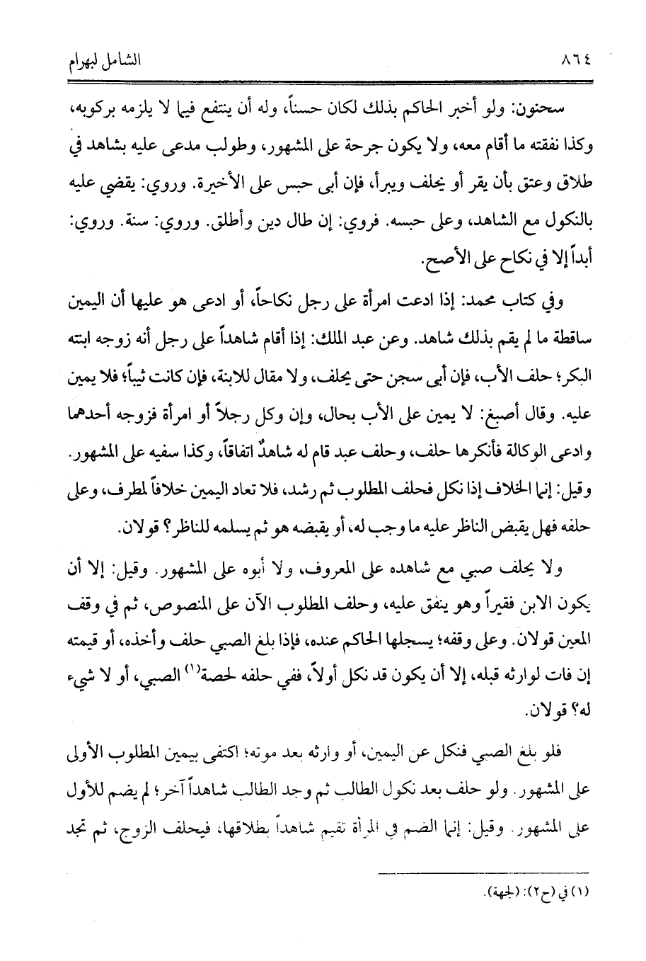 سحنون: ولو أخبر الحاكم بذلك لكان حسناً، وله أن ينتفع فيما لا يلزمه بركوبه، وكذا نفقته ما أقام معه، ولا يكون جرحة على المشهور، وطولب مدعى عليه بشاهد في طلاق وعتق بأن يقر أو يحلف ويبرأ، فإن أبى حبس على الأخيرة. وروي: يقضي عليه بالنكول مع الشاهد، وعلى حبسه. فروي: إن طال دين وأطلق. وروي: سنة. وروي: أبداً إلا في نكاح على الأصح.