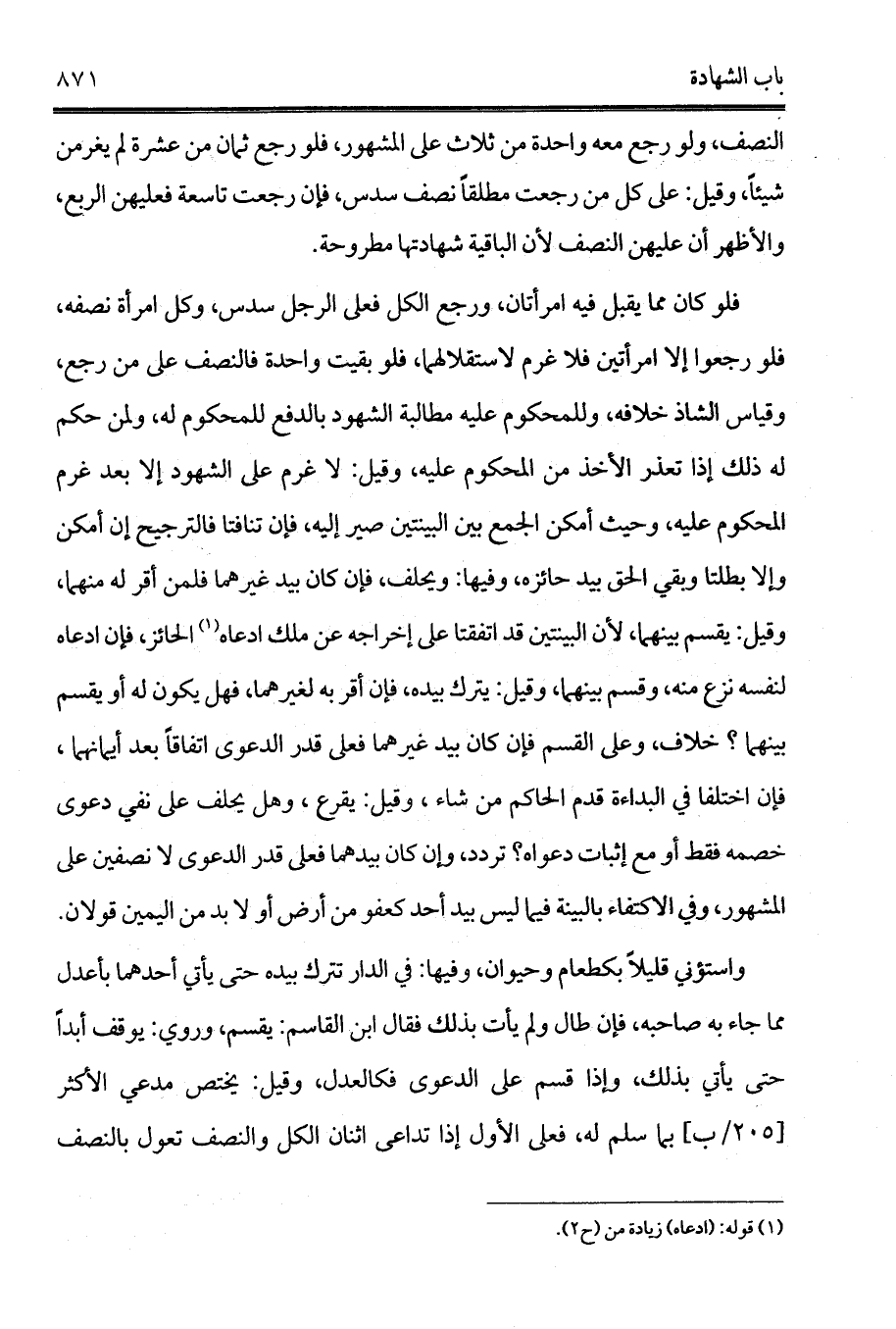 واستؤني قليلاً بكطعام وحيوان، وفيها: في الدار تترك بيده حتى يأتي أحدهما بأعدل مما جاء به صاحبه، فإن طال ولم يأت بذلك فقال ابن القاسم: يقسم، وروي: يوقف أبداً حتى يأتي بذلك، وإذا قسم على الدعوى فكالعدل، وقيل: يختص مدعي الأكثر [أ/205] بما سلم له، فعلى الأول إذا تداعى اثنان الكل والنصف تعول بالنصف