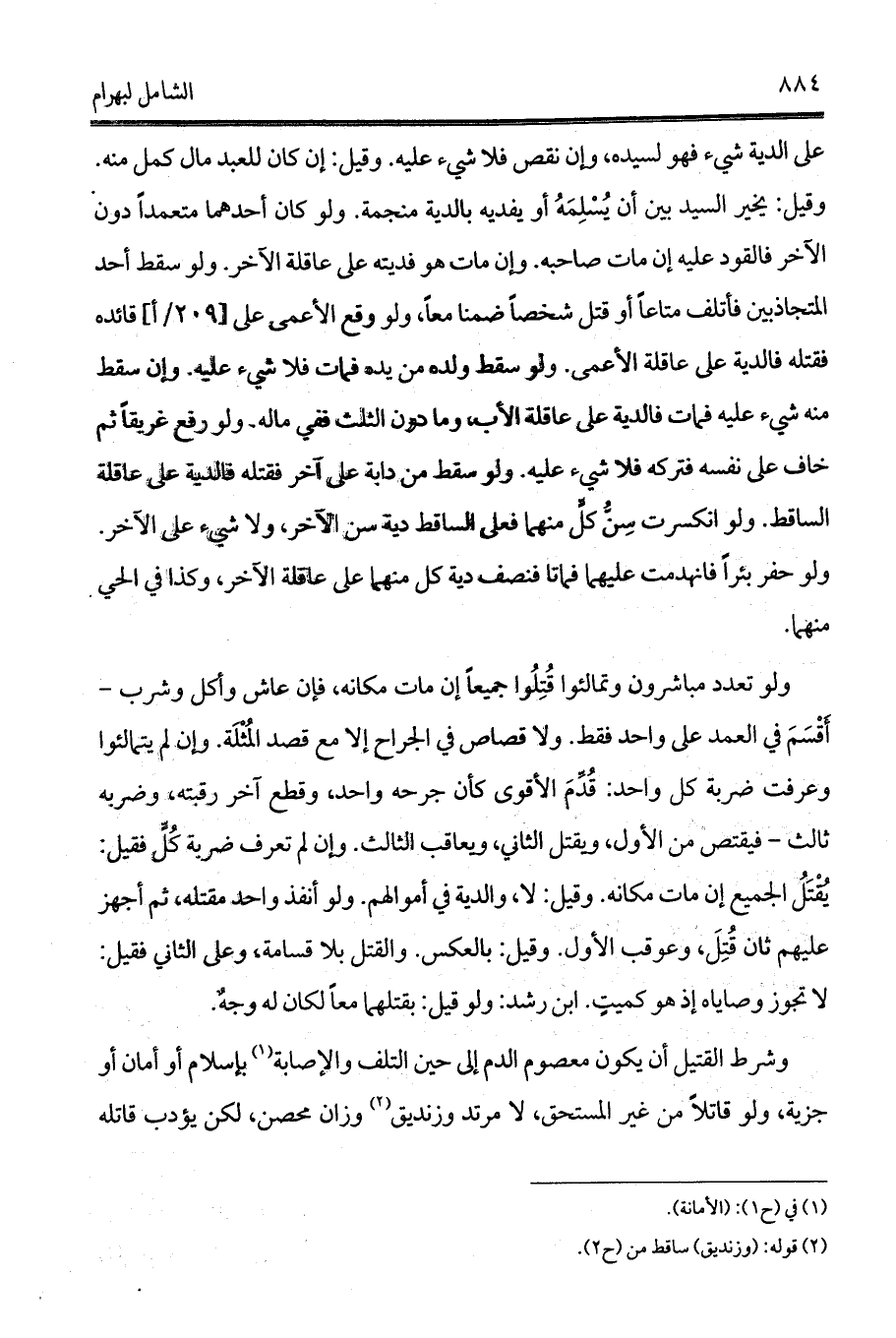 على الدية شيء فهو لسيده، وإن نقص فلا شيء عليه. وقيل: إن كان للعبد مال كمل منه. وقيل: يخير السيد بين أن يُسْلِمَهُ أو يفديه بالدية منجمة. ولو كان أحدهما متعمداً دون الآخر فالقود عليه إن مات صاحبه. وإن مات هو فديته على عاقلة الآخر. ولو سقط أحد المتجاذبين فأتلف متاعاً أو قتل شخصاً ضمنا معاً، ولو وقع الأعمى على [ب/208] قائده فقتله فالدية على عاقلة الأعمى. ولو سقط ولده من يده فمات فلا شيء عليه. وإن سقط منه شيء عليه فمات فالدية على عاقلة الأب، وما دون الثلث ففي ماله. ولو رفع غريقاً ثم خاف على نفسه فتركه فلا شيء عليه. ولو سقط من دابة على آخر فقتله فالدية على عاقلة الساقط. ولو انكسرت سِنُّ كلٍّ منهما فعلى الساقط دية سن الآخر، ولا شيء على الآخر. ولو حفر بئراً فانهدمت عليهما فماتا فنصف دية كل منهما على عاقلة الآخر، وكذا في الحي منهما.