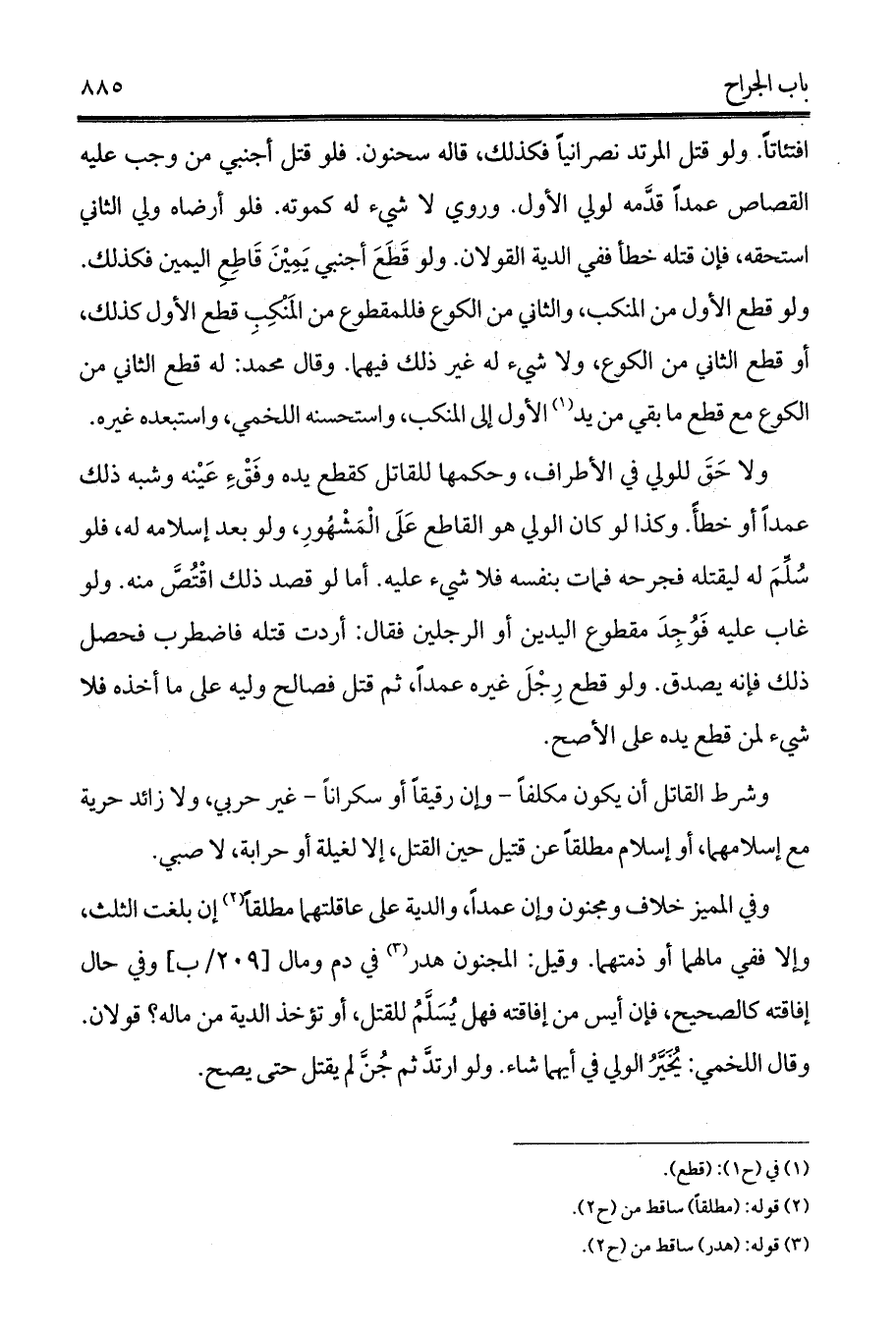 وشرط القاتل أن يكون مكلفاً - وإن رقيقاً أو سكراناً - غير حربي، ولا زائد حرية مع إسلامهما، أو إسلام مطلقاً عن قتيل حين القتل، إلا لغيلة أو حرابة، لا صبي.