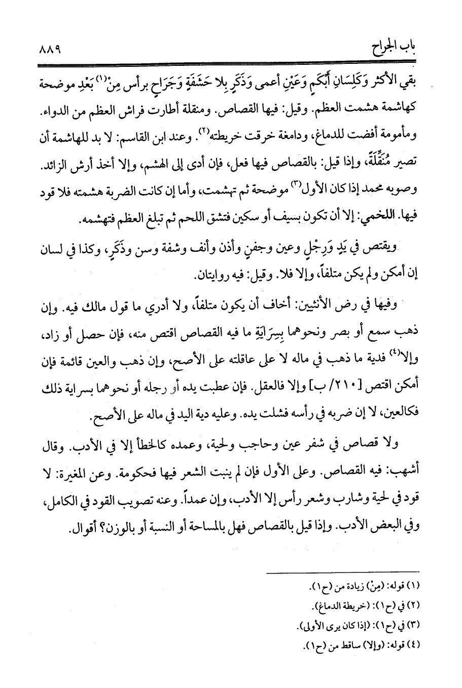 ولا قصاص في شفر عين وحاجب ولحية، وعمده كالخطأ إلا في الأدب. وقال أشهب: فيه القصاص. وعلى الأول فإن لم ينبت الشعر فيها فحكومة. وعن المغيرة: لا قود في لحية وشارب وشعر رأس إلا الأدب، وإن عمداً. وعنه تصويب القود في الكامل، وفي البعض الأدب. وإذا قيل بالقصاص فهل بالمساحة أو النسبة أو بالوزن؟ أقوال.