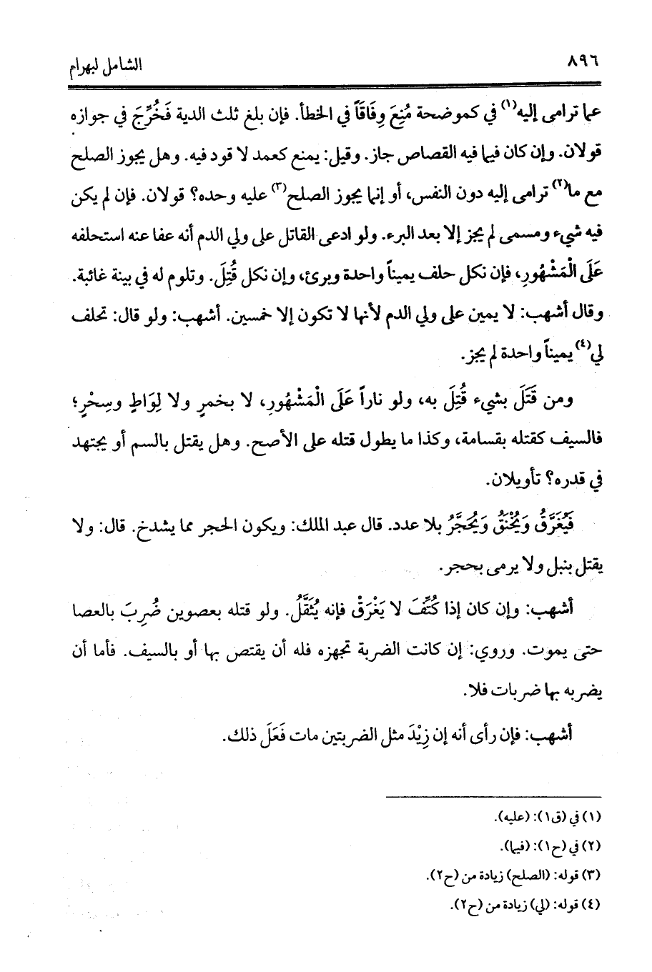 أشهب: وإن كان إذا كُتِّفَ لا يَغْرَقْ فإنه يُثَقَّلُ. ولو قتله بعصوين ضُرِبَ بالعصا حتى يموت. وروي: إن كانت الضربة تجهزه فله أن يقتص بها أو بالسيف. فأما أن يضربه بها ضربات فلا.