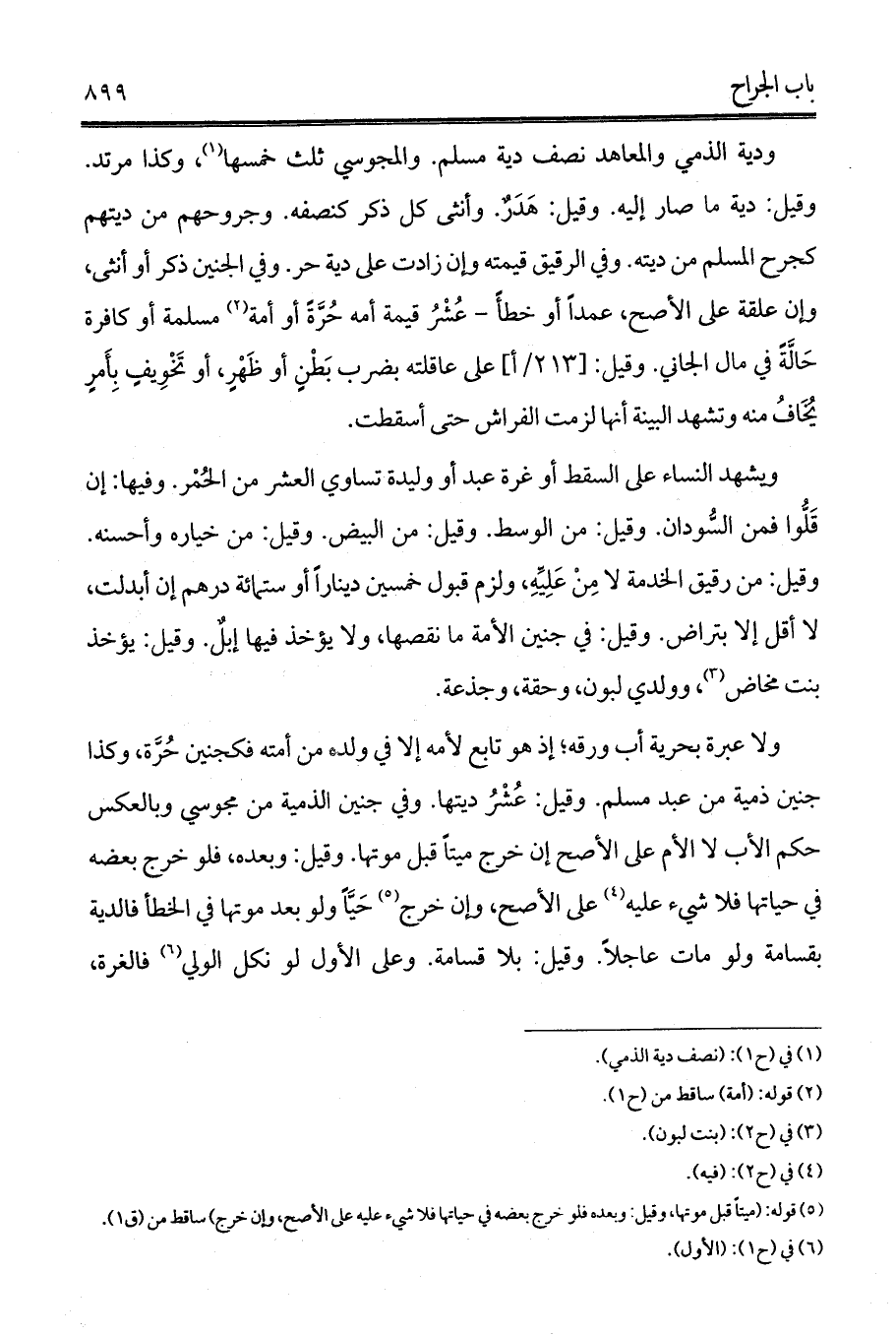 ودية الذمي والمعاهد نصف دية مسلم. والمجوسي ثلث خمسها (¬1)، وكذا مرتد. وقيل: دية ما صار إليه. وقيل: هَدَرٌ. وأنثى كل ذكر كنصفه. وجروحهم من ديتهم كجرح المسلم من ديته. وفي الرقيق قيمته وإن زادت على دية حر. وفي الجنين ذكر أو أنثى، وإن علقة على الأصح، عمداً أو خطأً - عُشْرُ قيمة أمه حُرَّةً أو أمة (¬2) مسلمة أو كافرة حَالَّةً في مال الجاني. وقيل: [ب/212] على عاقلته بضرب بَطْنٍ أو ظَهْرٍ، أو تَخْوِيفٍ بِأَمرٍ يُخَافُ منه وتشهد البينة أنها لزمت الفراش حتى أسقطت.