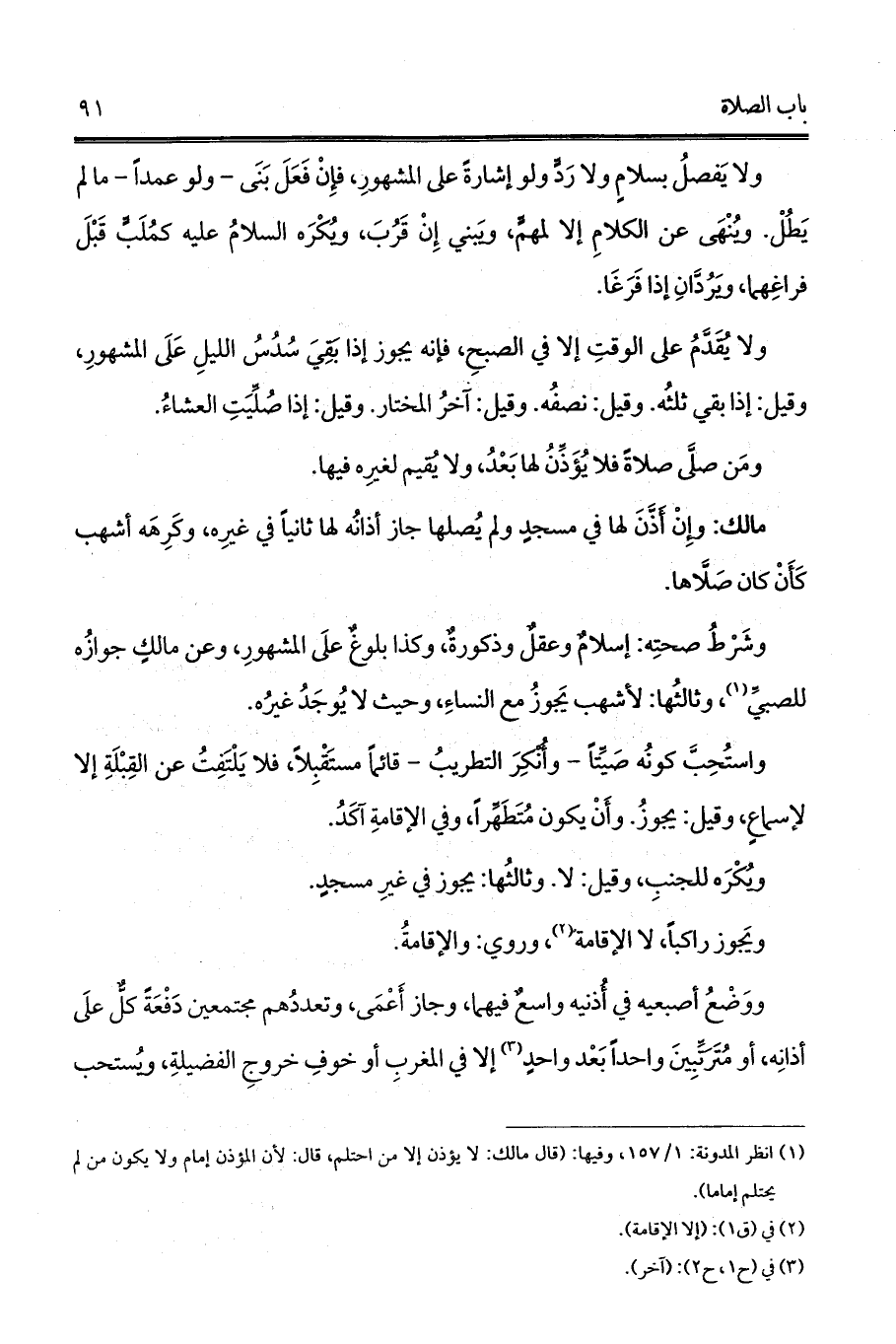 (¬1) انظر المدونة: 1/ 157، وفيها: (قال مالك: لا يؤذن إلا من احتلم، قال: لأن المؤذن إمام ولا يكون من لم يحتلم إماما).