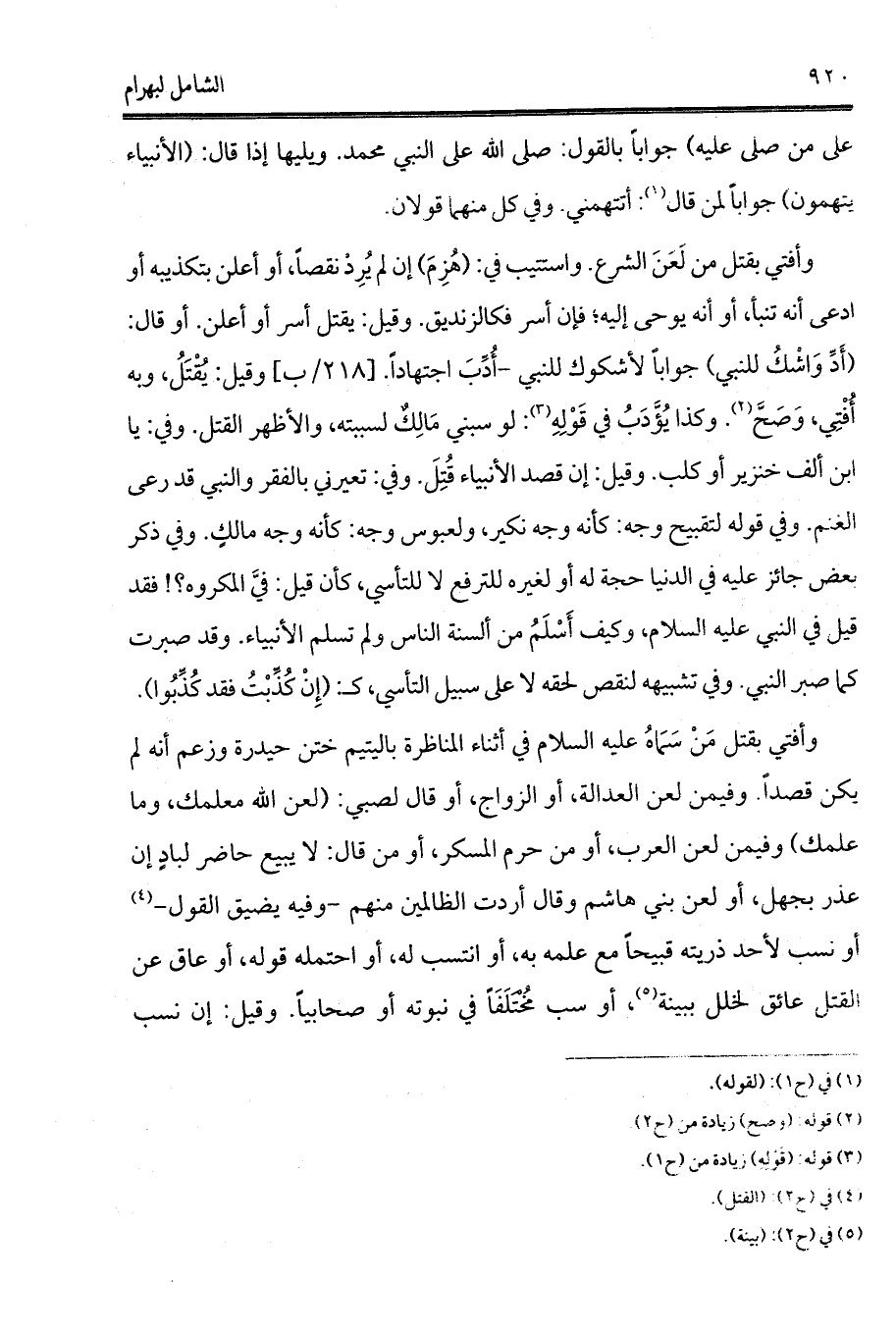 وأفتي بقتل مَنْ سَمَاهُ عليه السلام في أثناء المناظرة باليتيم ختن حيدرة وزعم أنه لم يكن قصداً. وفيمن لعن العدالة، أو الزواج، أو قال لصبي: (لعن الله معلمك، وما علمك) وفيمن لعن العرب، أو من حرم المسكر، أو من قال: لا يبيع حاضر لبادٍ إن عذر بجهل، أو لعن بني هاشم وقال أردت الظالمين منهم -وفيه يضيق القول- (¬3) أو نسب لأحد ذريته قبيحاً مع علمه به، أو انتسب له، أو احتمله قوله، أو عاق عن القتل عائق لخلل ببينة (¬4)، أو سب مُخْتَلَفَاً في نبوته أو صحابياً. وقيل: إن نسب